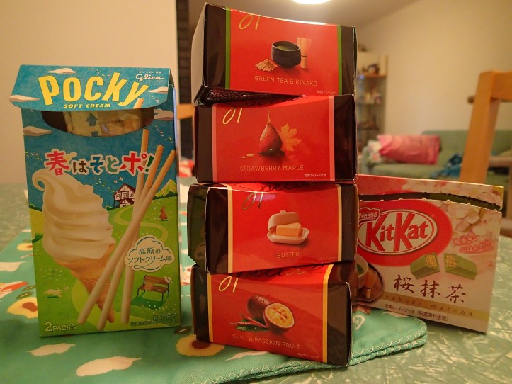 Well, no trip to Japan is complete without the obligatory haul of Japanese snacks to bring back home. Assorted Kit Kats (flavours include: sake, butter and passion fruit & chilli), Rocye chocolate covered chips (that Steve had to wait in line for about 40 minutes for at Narita airport), Soft serve icecream flavoured Pocky and more. It’s means we can hold on to our holiday just that tiny little bit more….