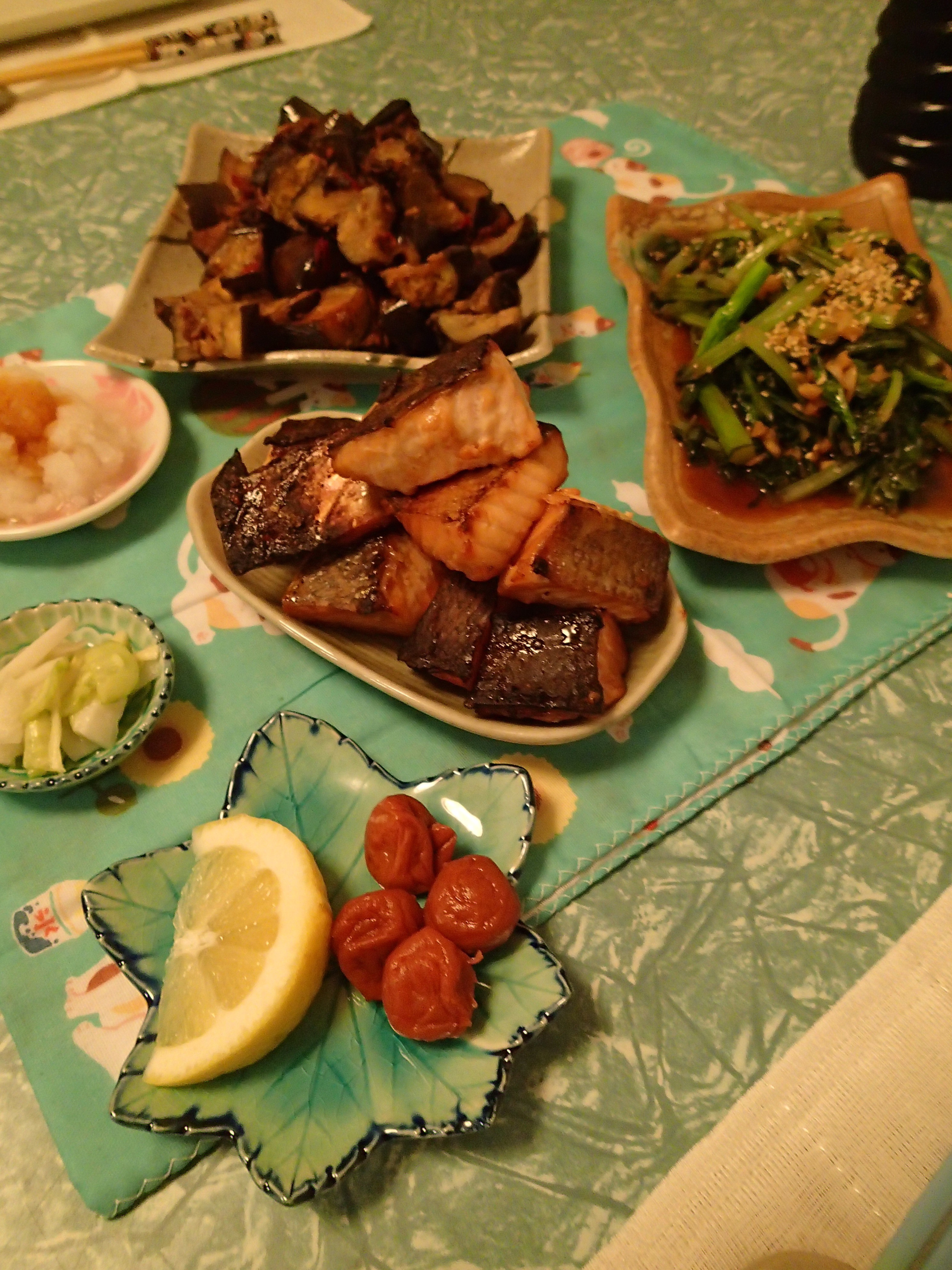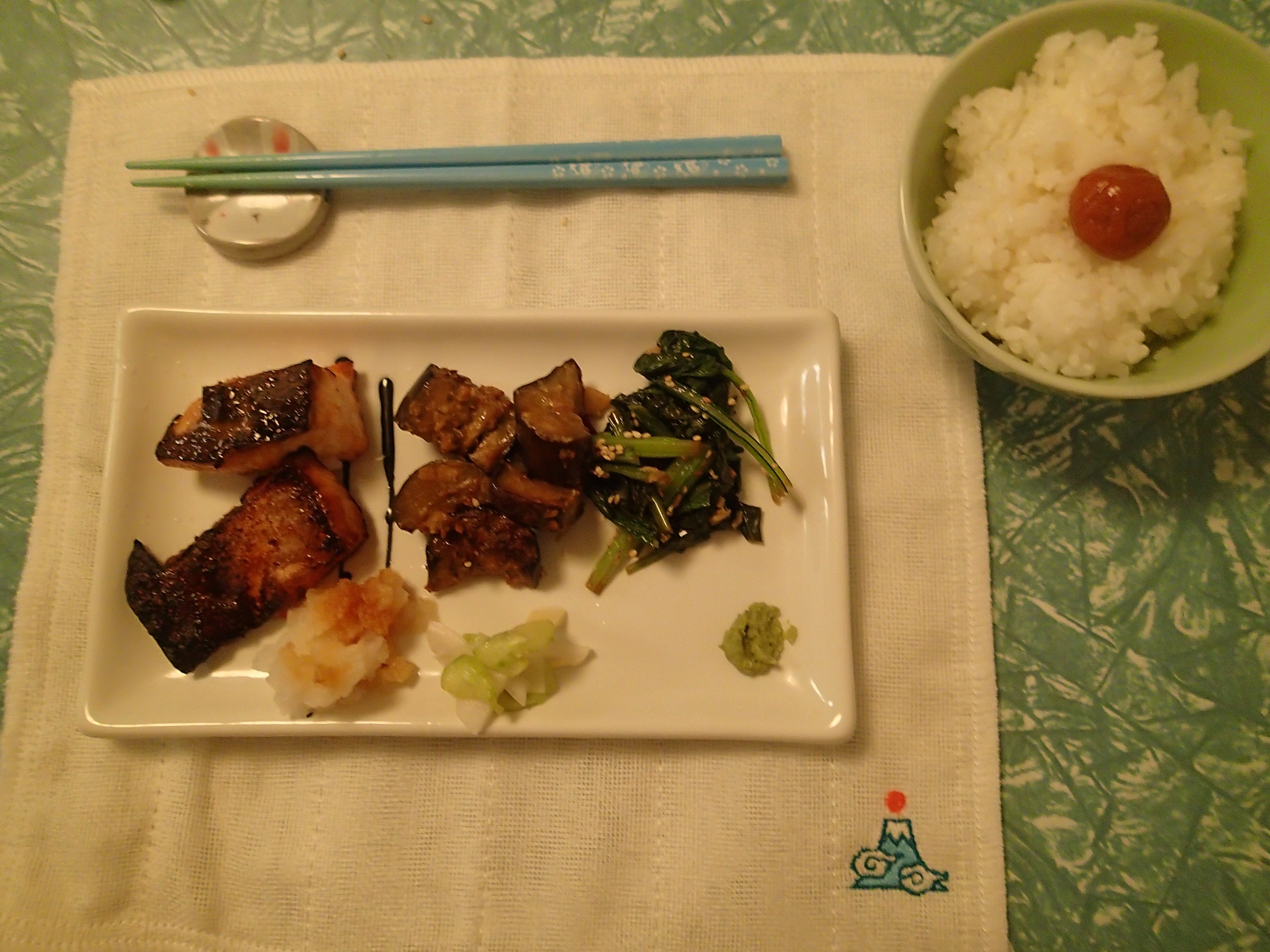 Miso marinated salmon, miso eggplant, Asian greens, rice and the closest thing to fresh wasabi that I could bring home to Australia!