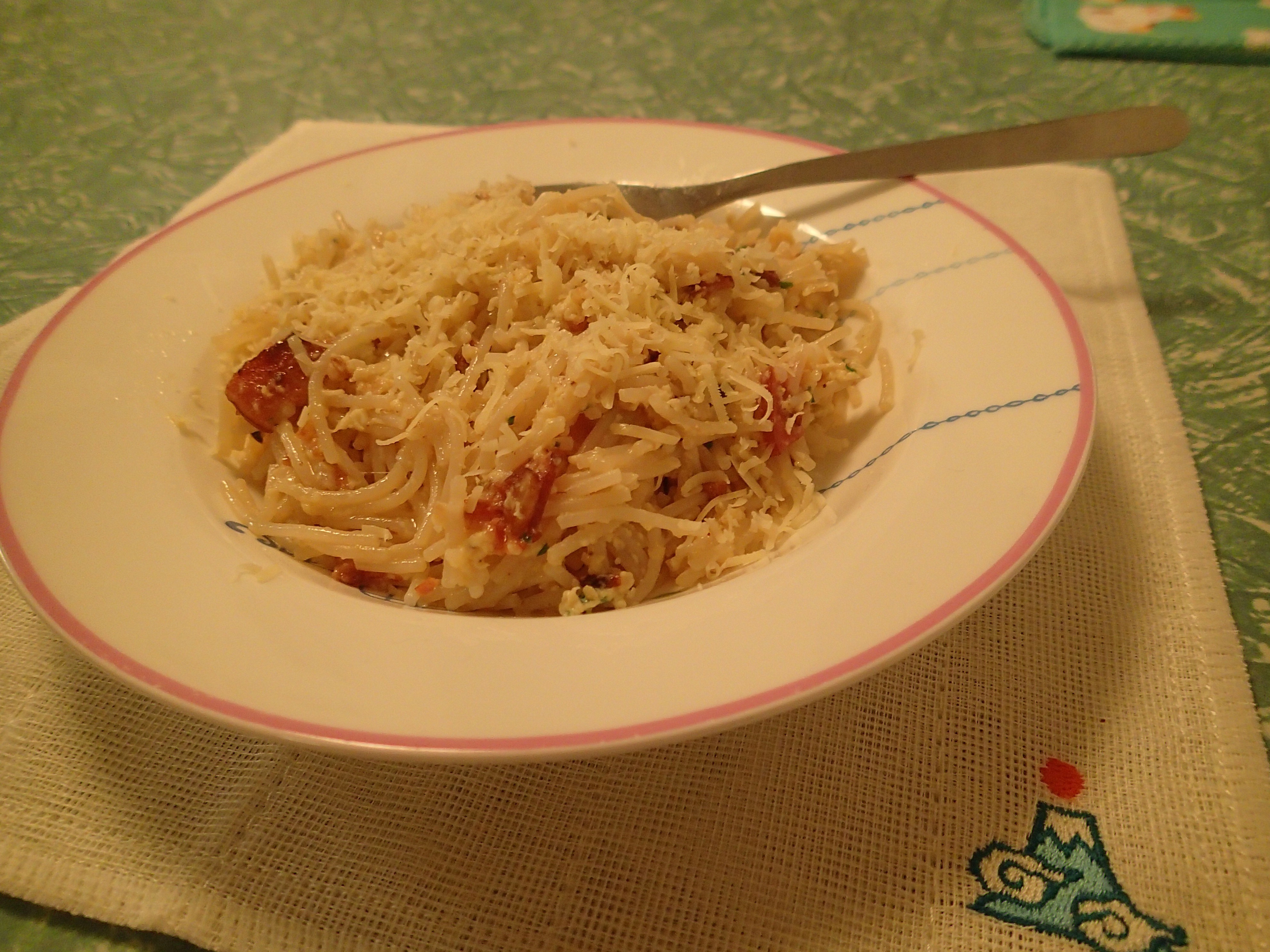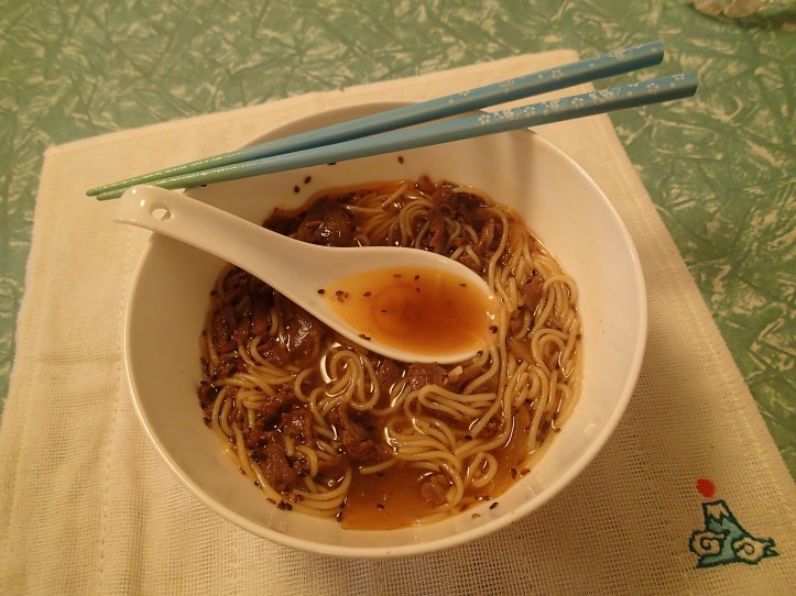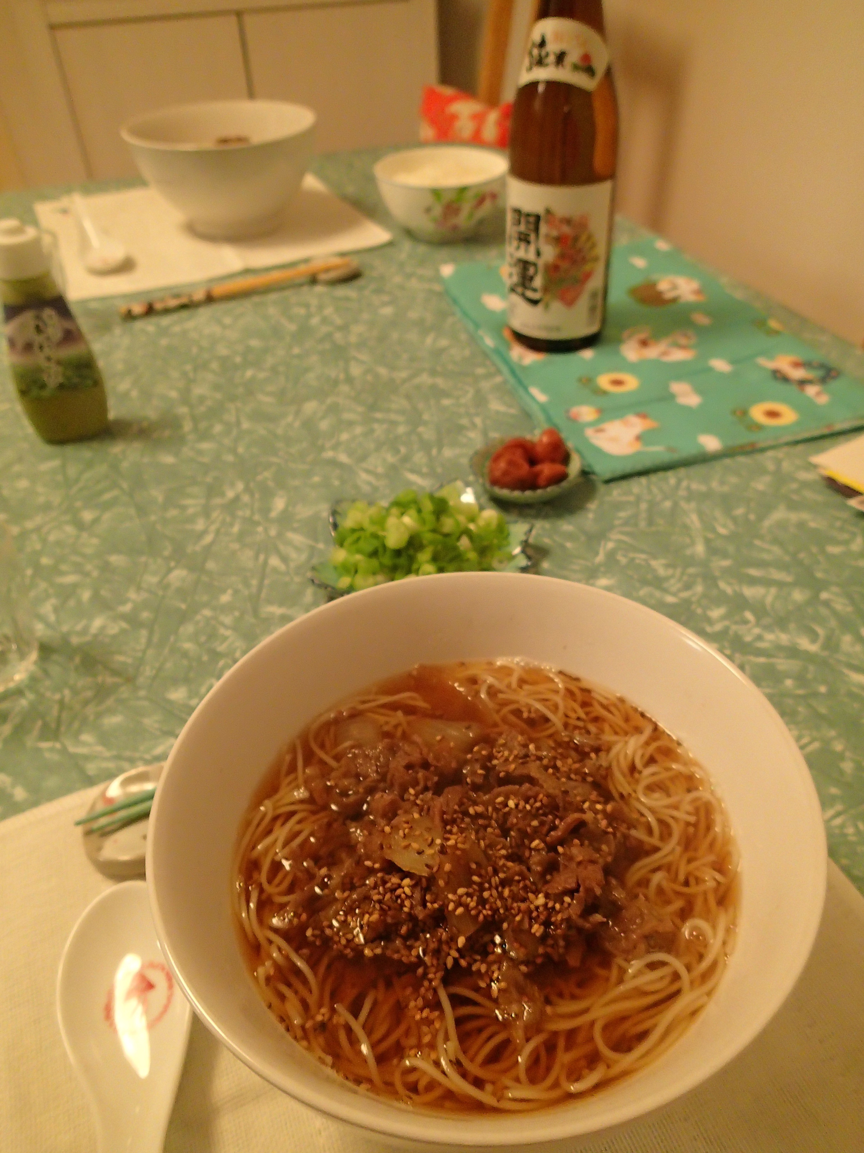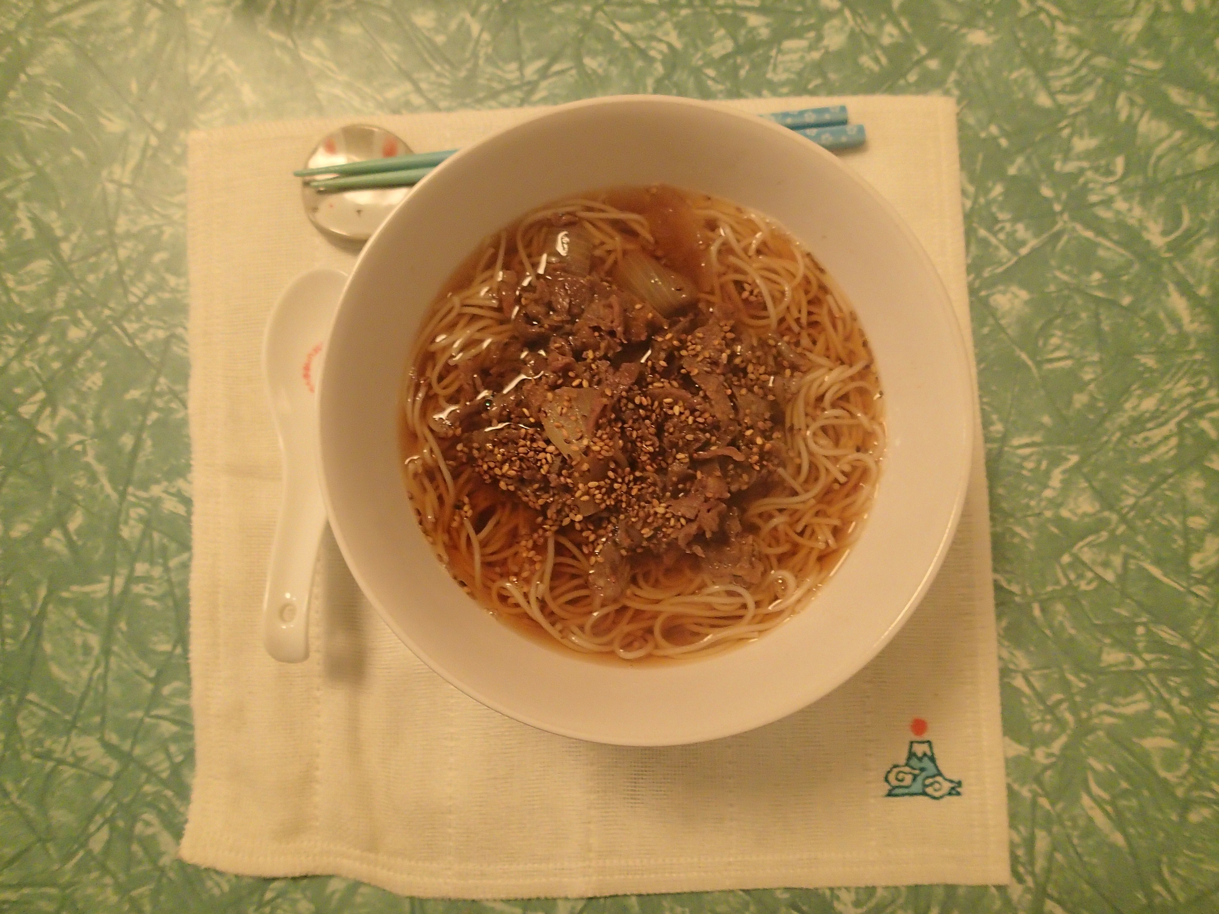Sweet beef udon noodles soup. Except I didn’t have any udon, so I had to use somen noodles instead.