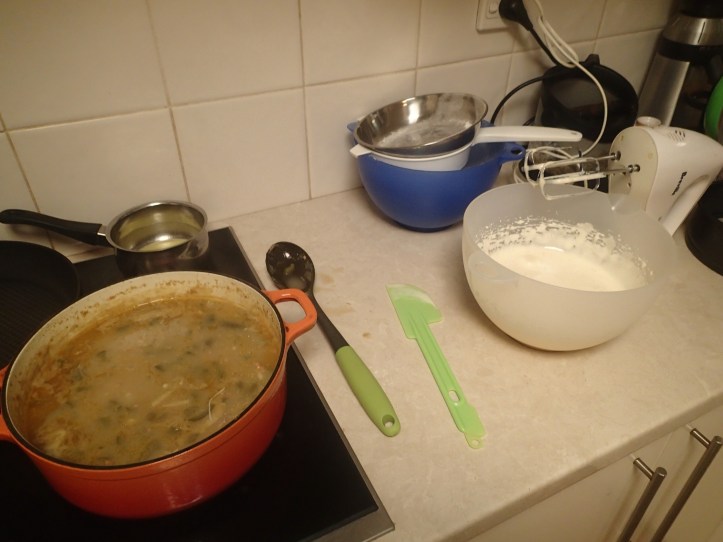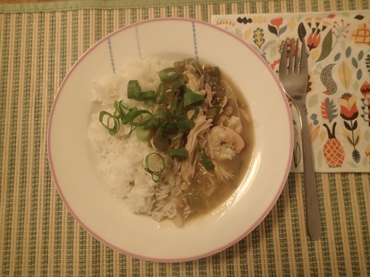 The batter was really light and fluffy – almost soufflé like. The cake went in to the oven and whilst it was baking we had our gumbo dinner. Super delicious.
