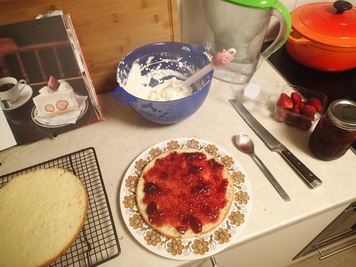 I carefully sliced the sponge in half which was quite successful. I didn’t have any Kirsch on hand (being of Austrian descent I actually normally do 😊) which is what I was meant to put on the sponge first, so instead I used some of our recently made strawberry jam.