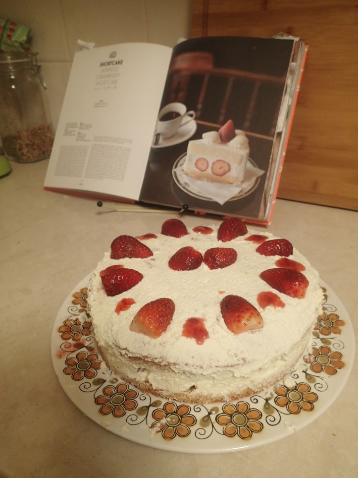 Then, the moment of truth. Did my cake turn out? Well, almost. It cooked nicely, but it stuck to the pan a little and didn’t look as light as fluffy as a Strawberry Shortcake sponge should be. I let it cool down good and proper.