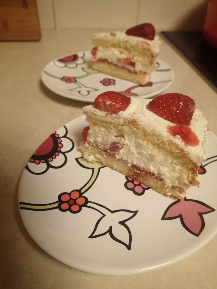 Then I put a whole load of cream and sugar and strawberries 🍓 on top of the jam, then put the top half of the sponge back on. I unfortunately (or maybe it was actually fortunate?) didn’t have enough cream to decorate the top and side properly. I was also a bit short on strawberries. So I just put a thin covering of cream on top and some strawberries. Not as pretty as it should be, but well, it was a spur of the minute decision to make this cake, so you can’t have everything.