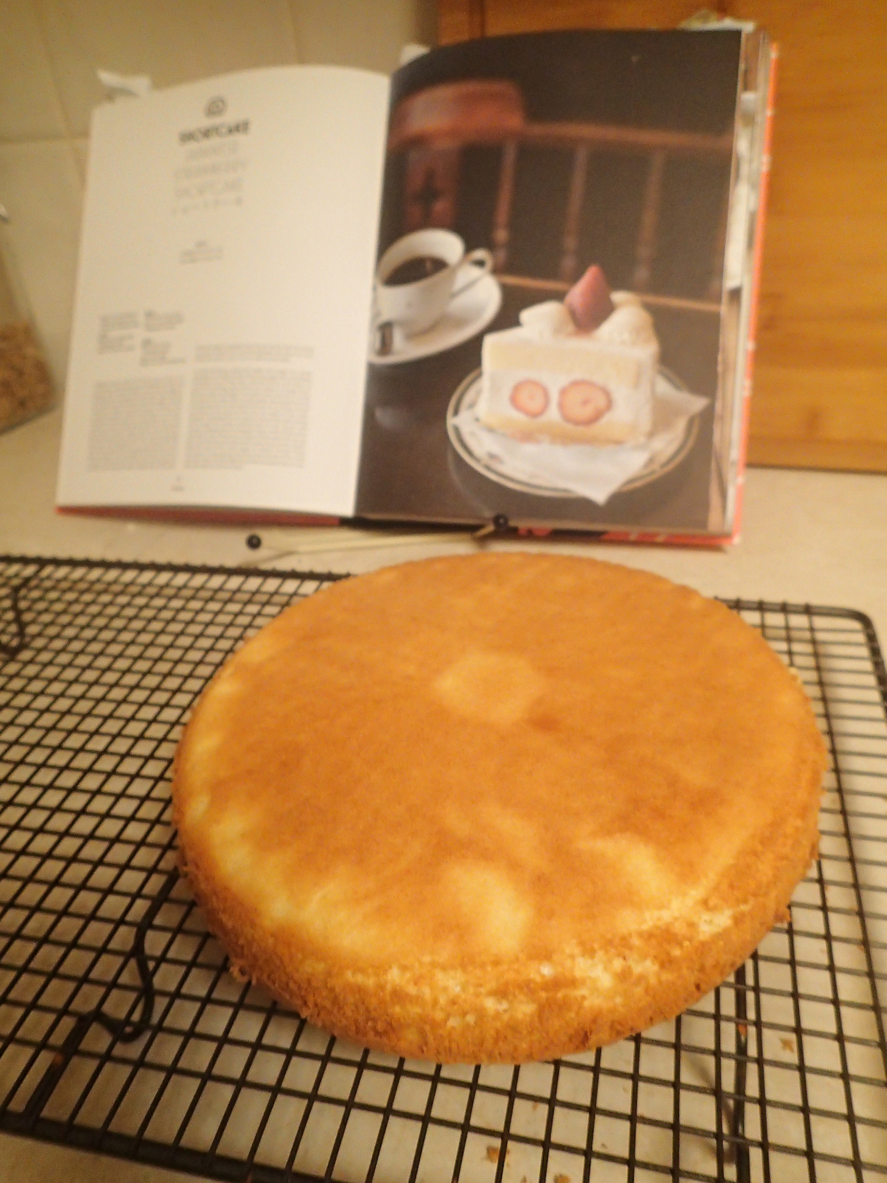 Then, the moment of truth. Did my cake turn out? Well, almost. It cooked nicely, but it stuck to the pan a little and didn’t look as light as fluffy as a Strawberry Shortcake sponge should be. I let it cool down good and proper.