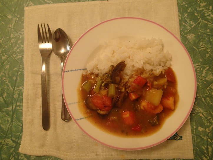 I made a Japanese vegetable curry. I was trying to emulate a curry Steve enjoyed half way around Lake Kawaguchi on the day we rode our bikes around it. I’m not sure if I was successful because I don’t know what the original curry tasted like! Either way, this one was pretty tasty.