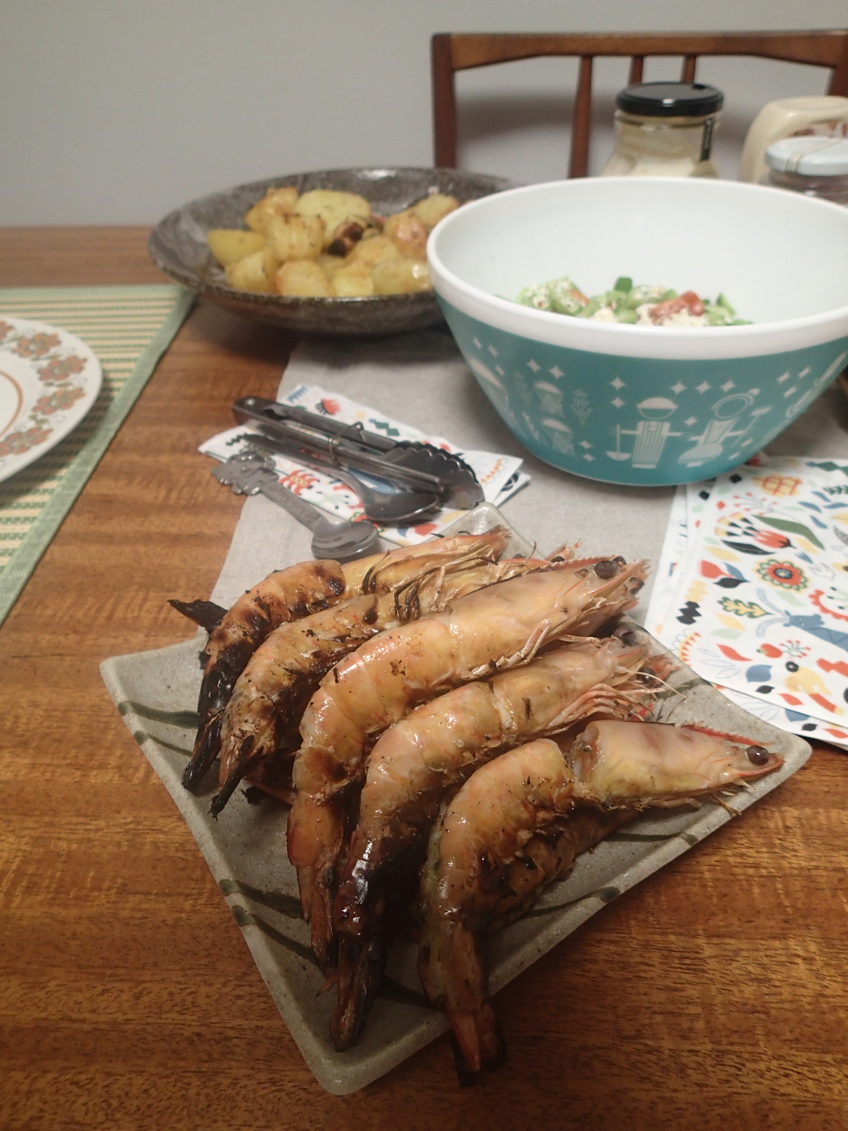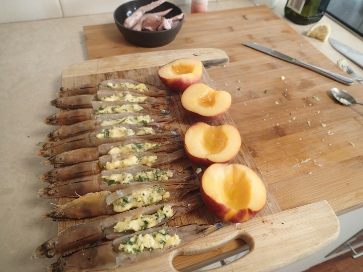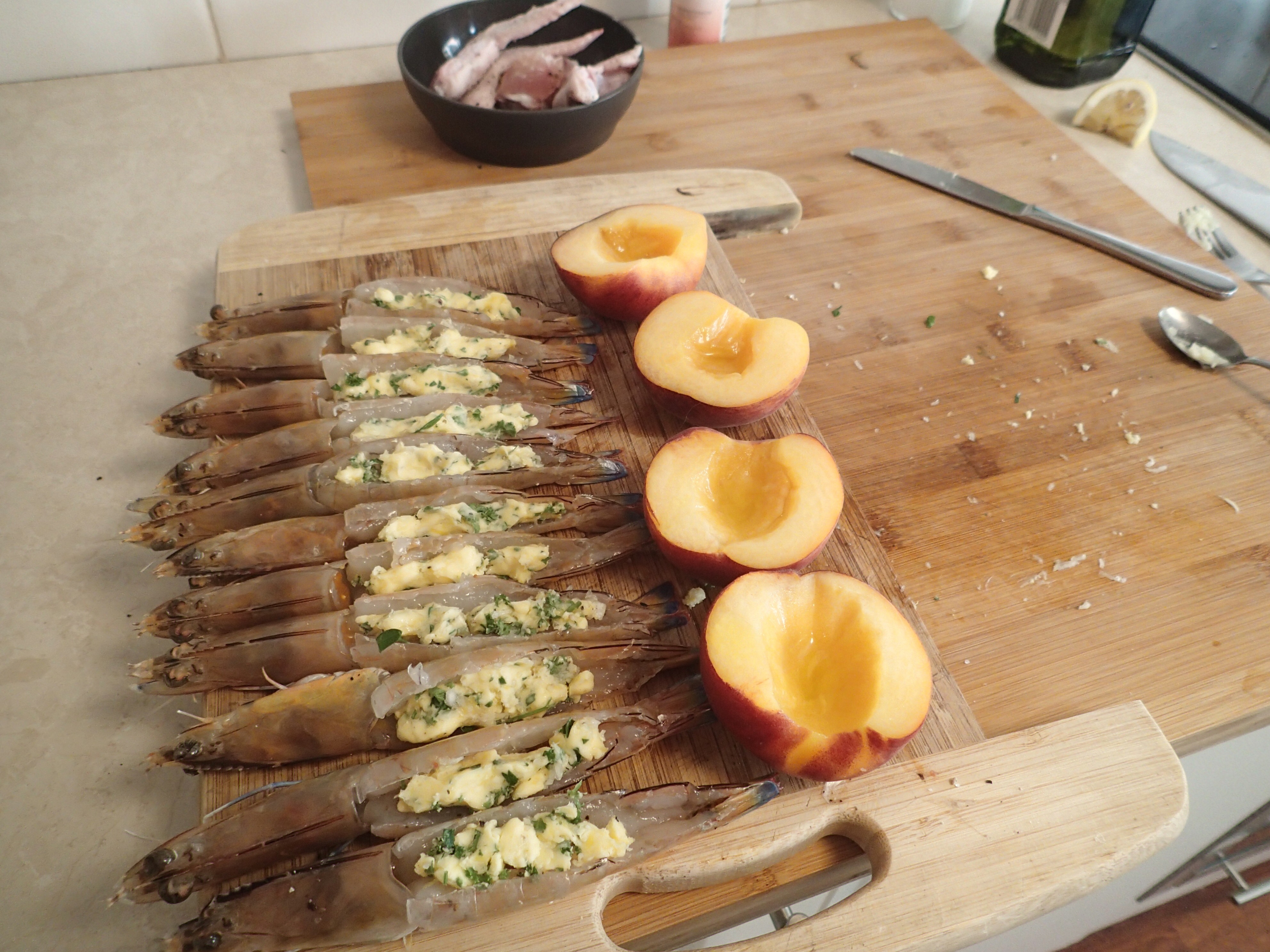 Grilled up some prawns (with garlic and parsley butter), chicken wings and peaches. And I also roasted some potatoes and made a quick salad.