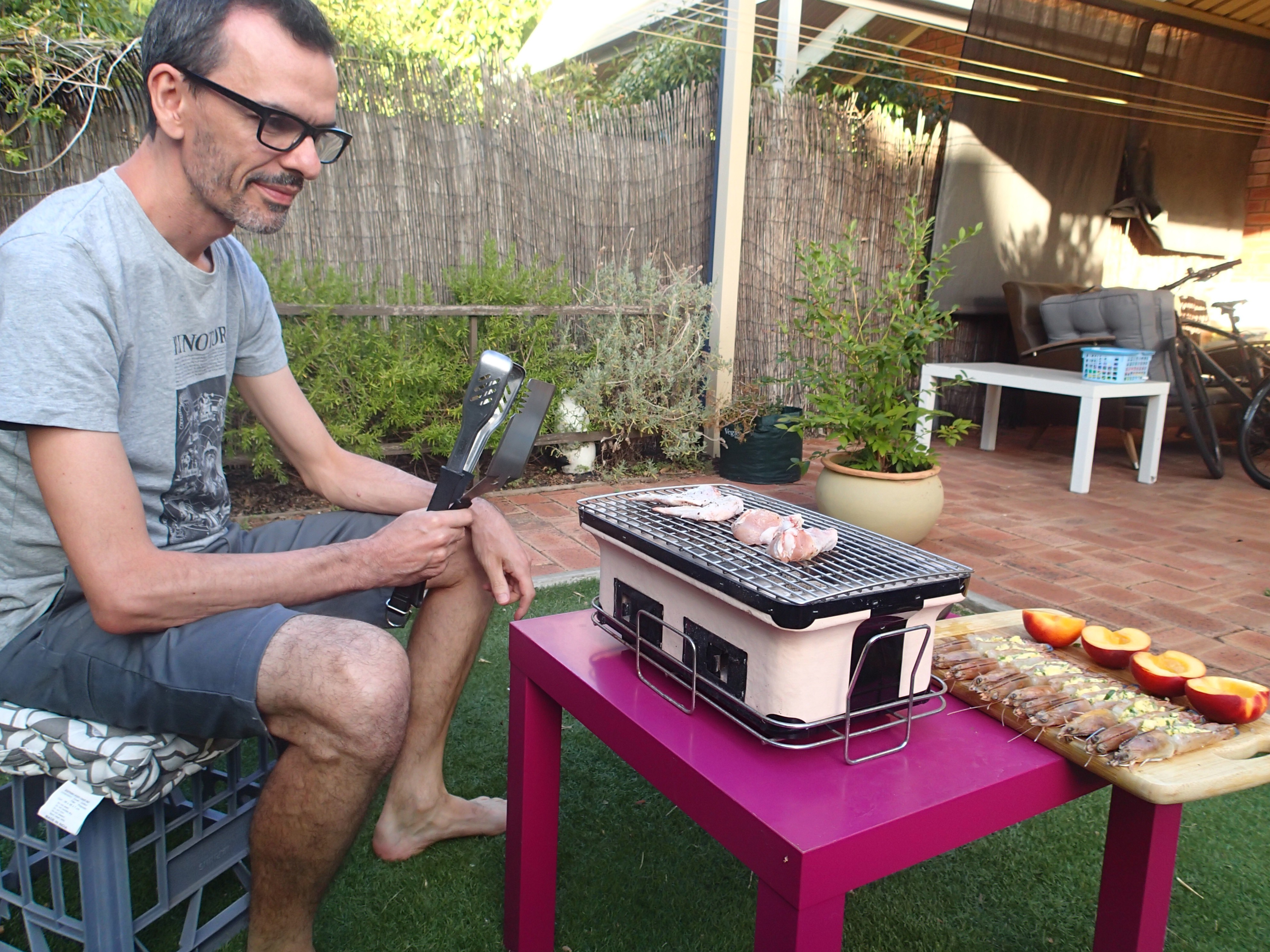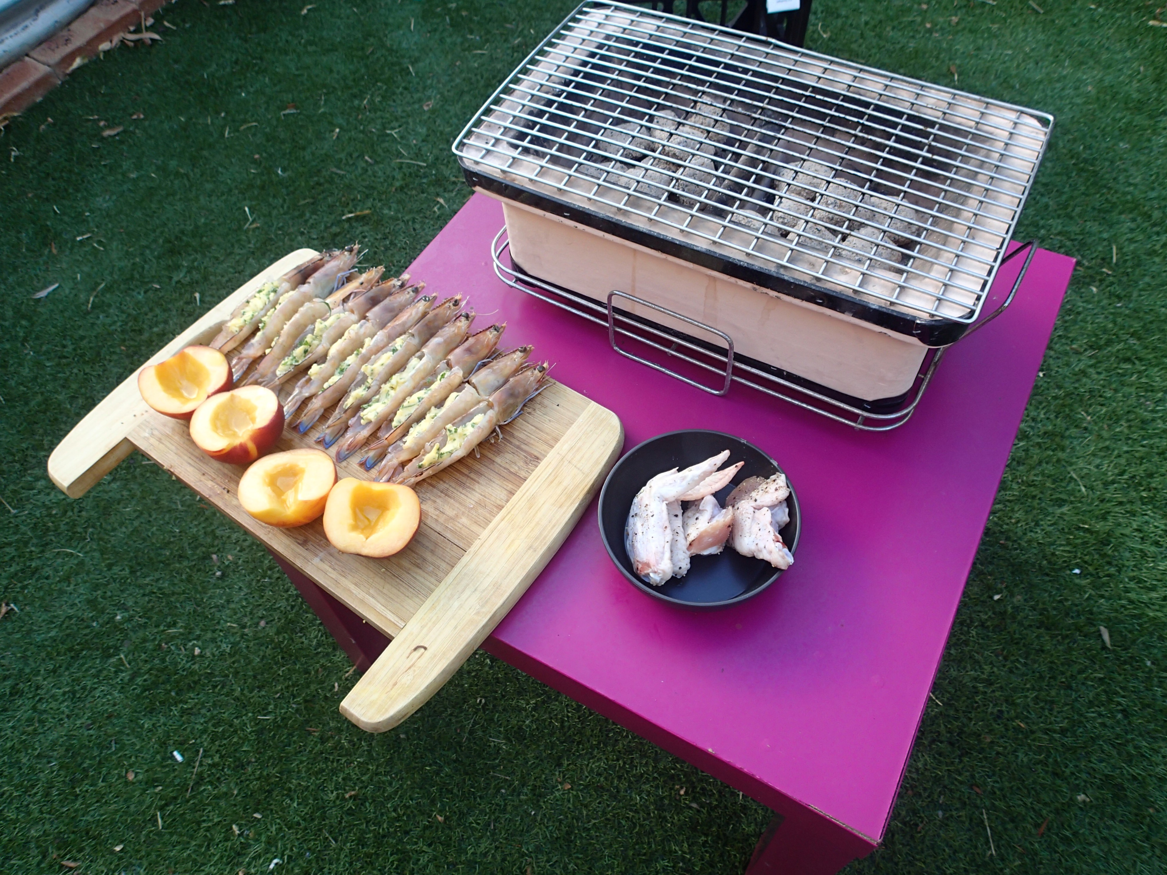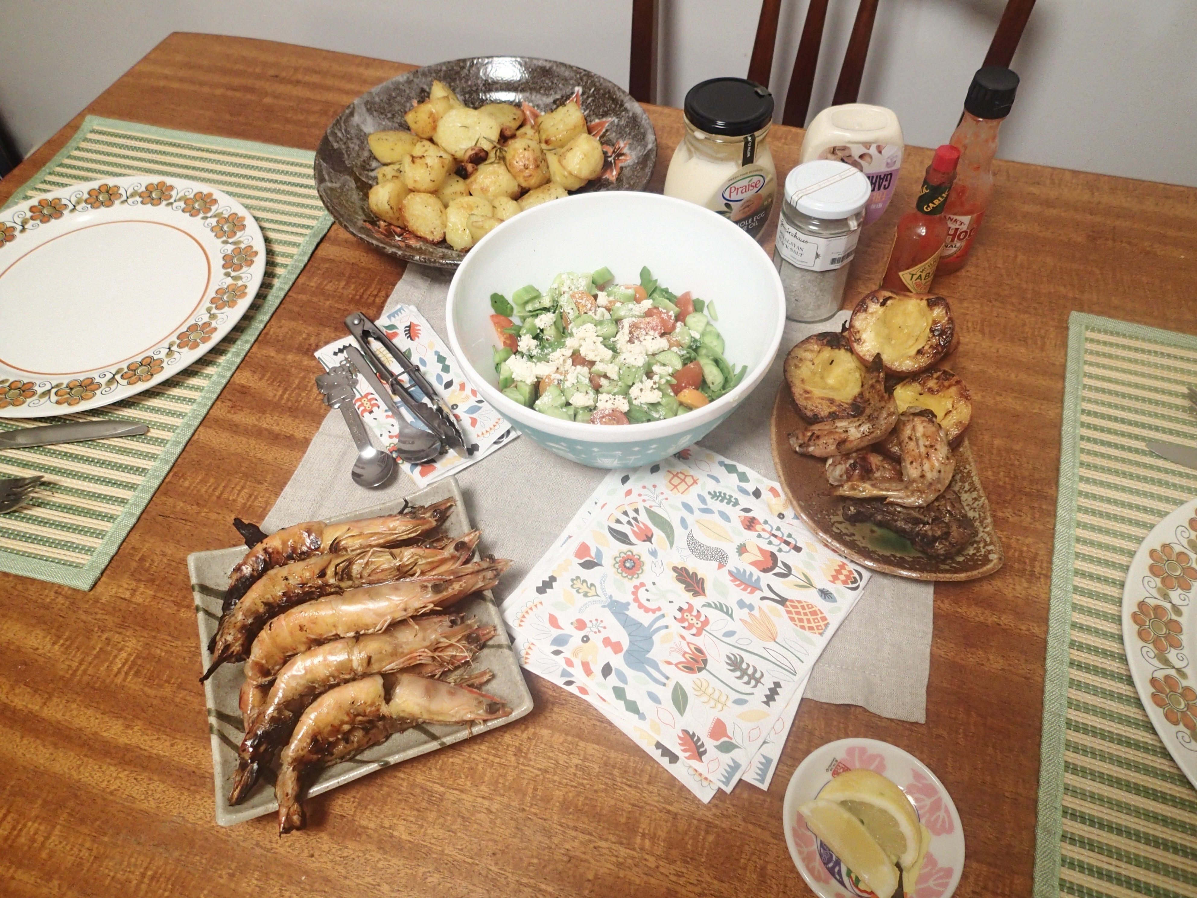 Grilled up some prawns (with garlic and parsley butter), chicken wings and peaches. And I also roasted some potatoes and made a quick salad.