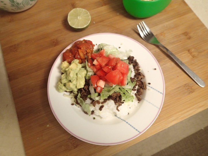 Taco rice preparation. Usually I just prepare all the ingredients, then we just make up our bowls ourselves. That way you can make it the way you like it.