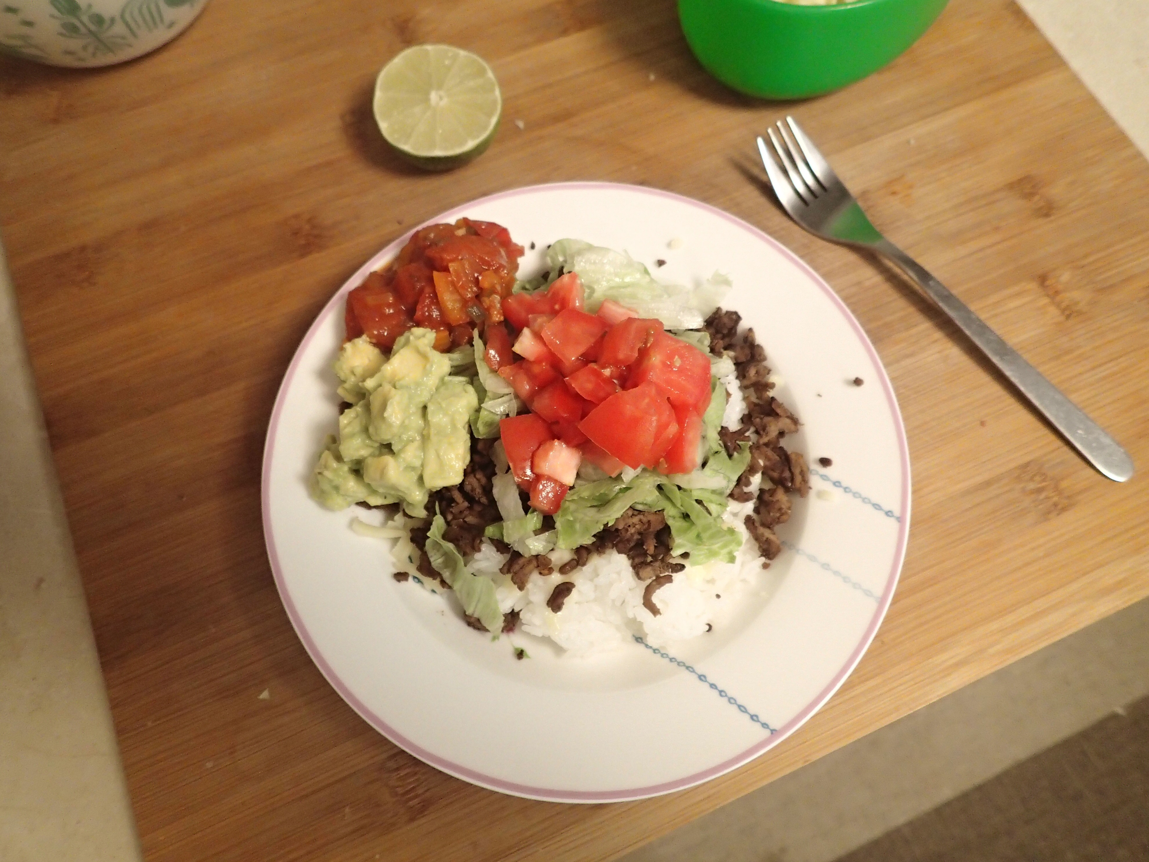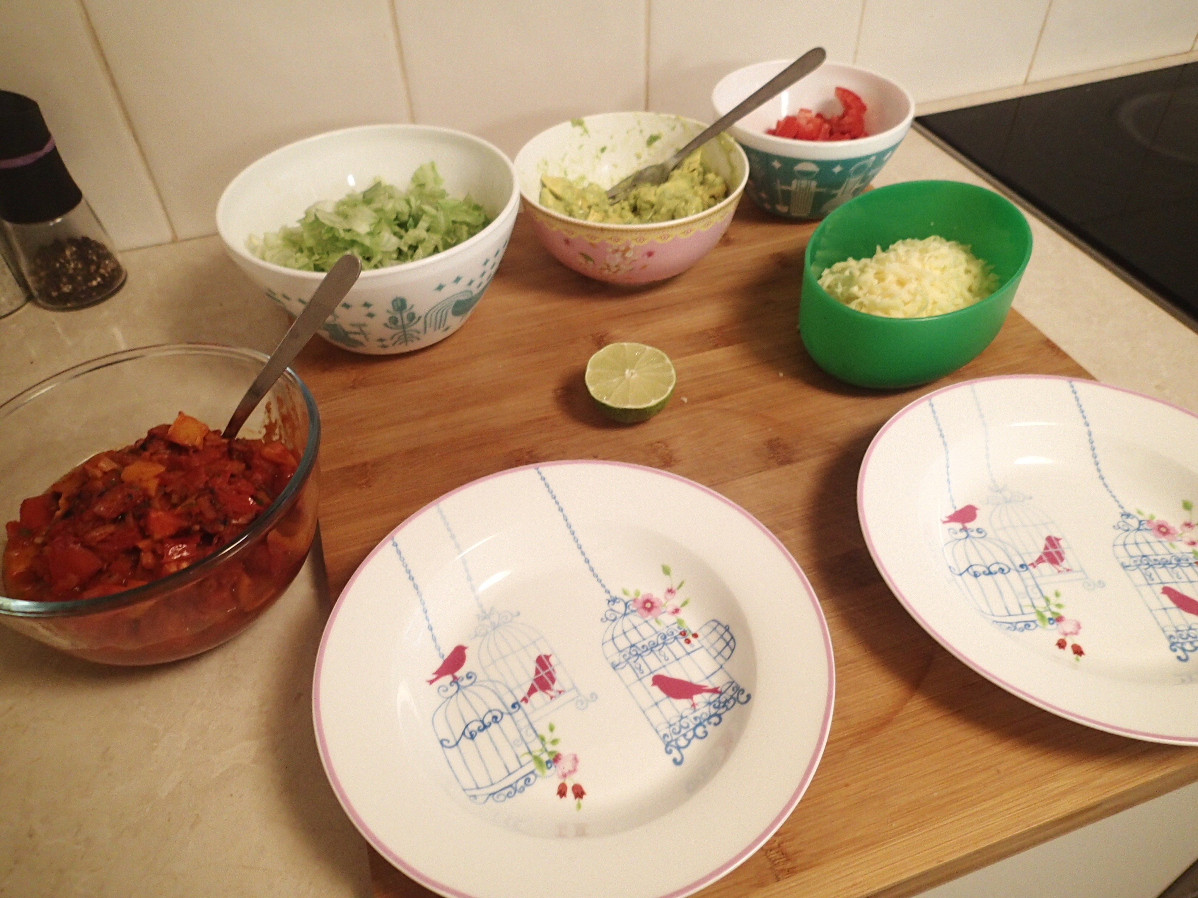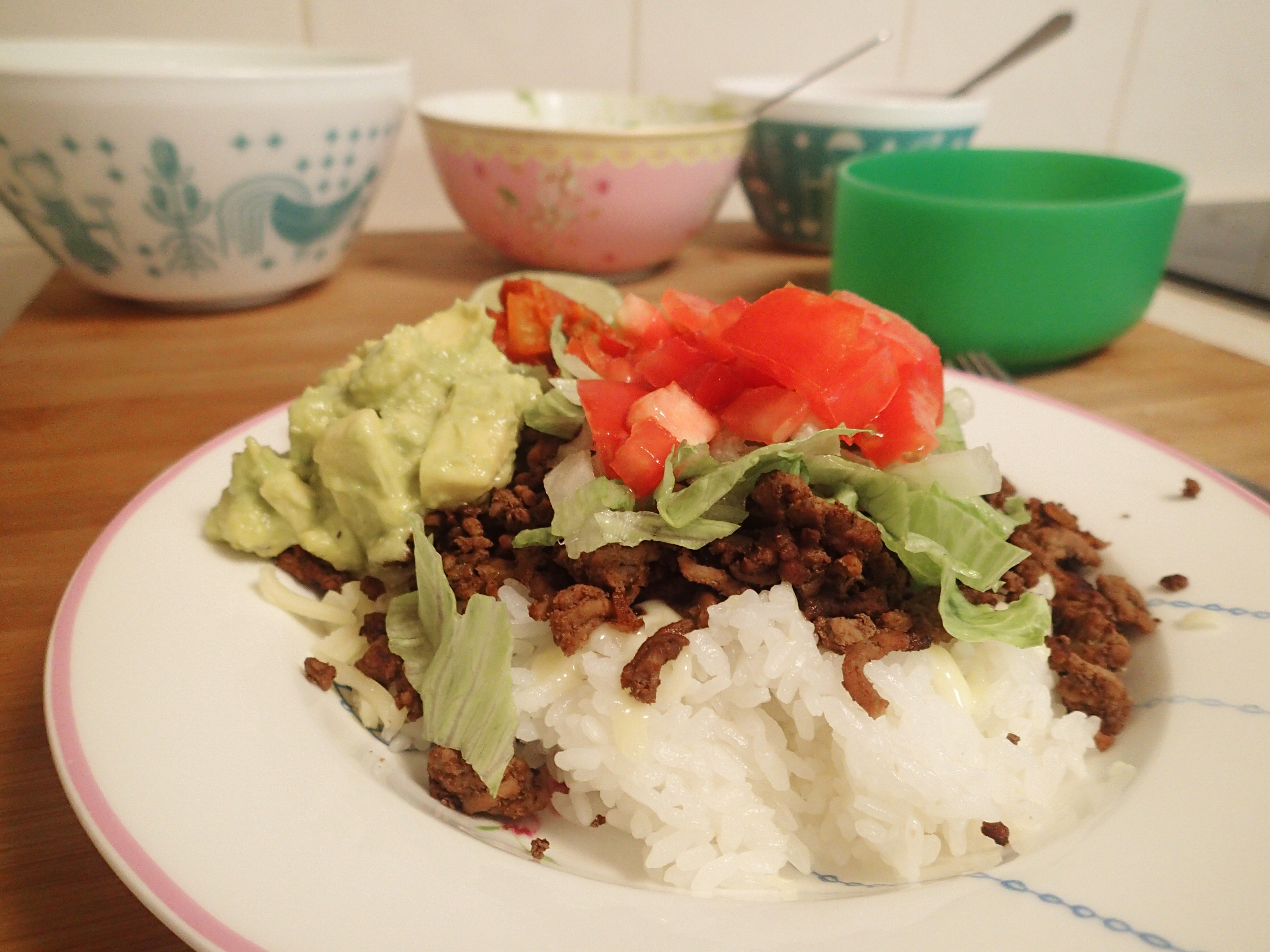 Taco rice preparation. Usually I just prepare all the ingredients, then we just make up our bowls ourselves. That way you can make it the way you like it.