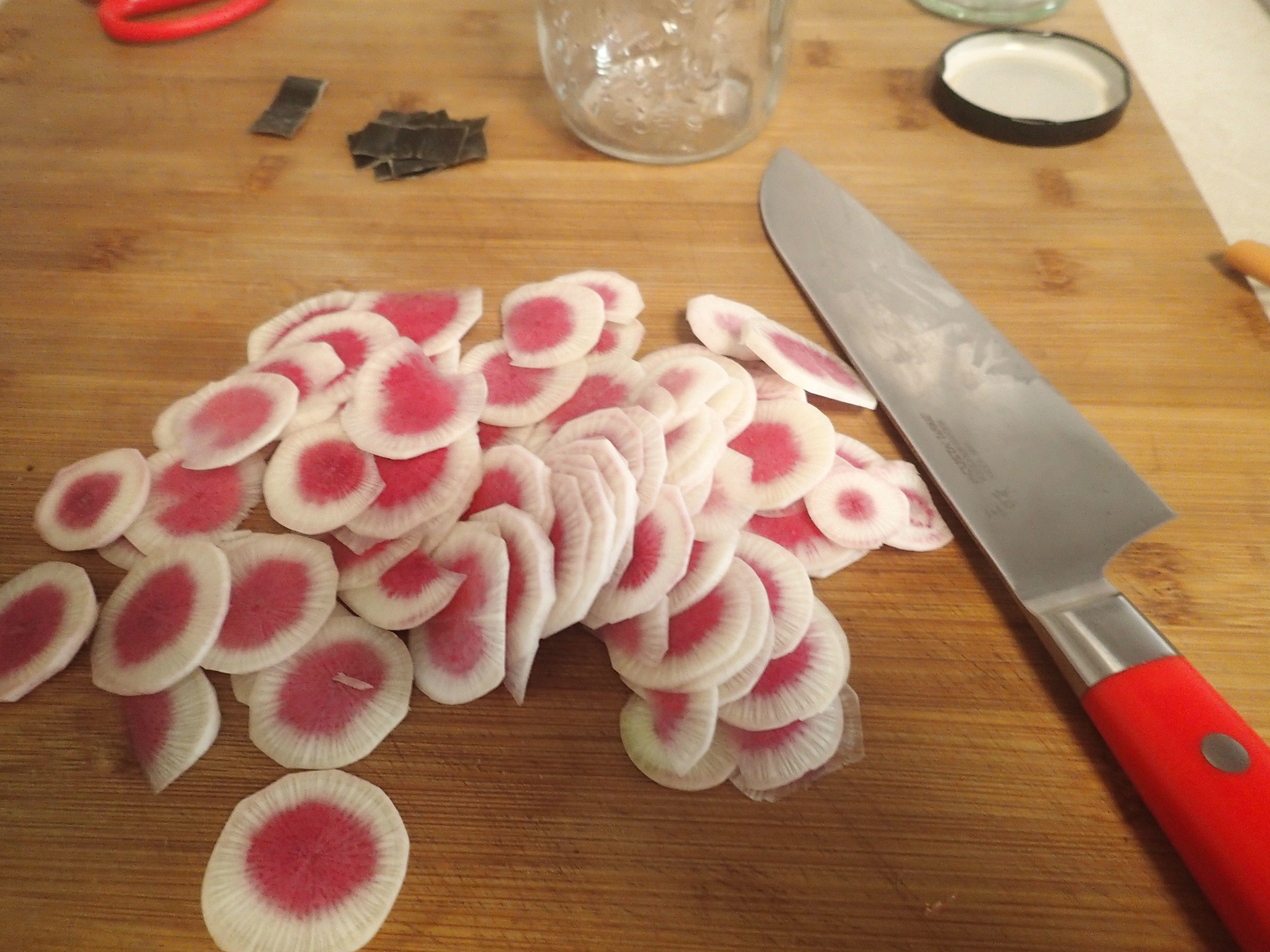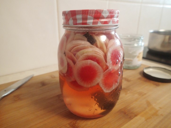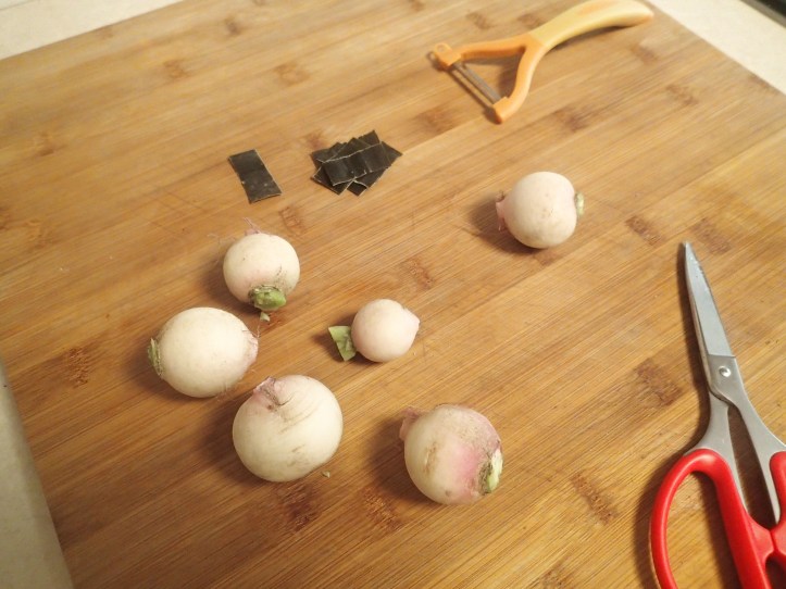 I got some baby turnips, although I’m not quite sure if that’s what they are as they smell quite radish-y. Anyway I decided to pickle them when I got home.