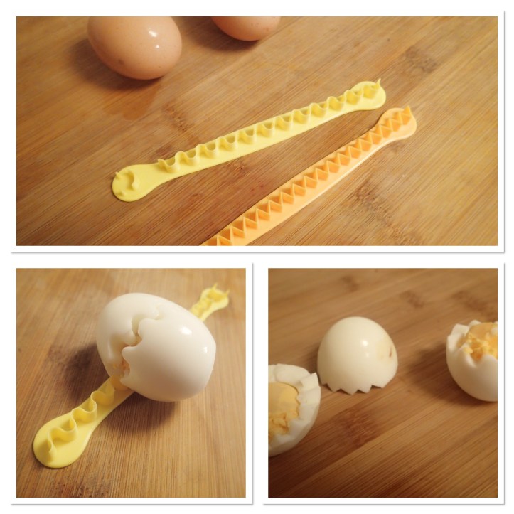 I got these cool plastic hard boiled egg cutter things from Miyu (the closest thing we have in Perth to a Daiso or 100 Yen Store). After peeling a hard boiled egg, you roll it on the cutter and it cuts the egg in half in a zig zag pattern. Mine turned out a little messy, but I just need to practice some more!