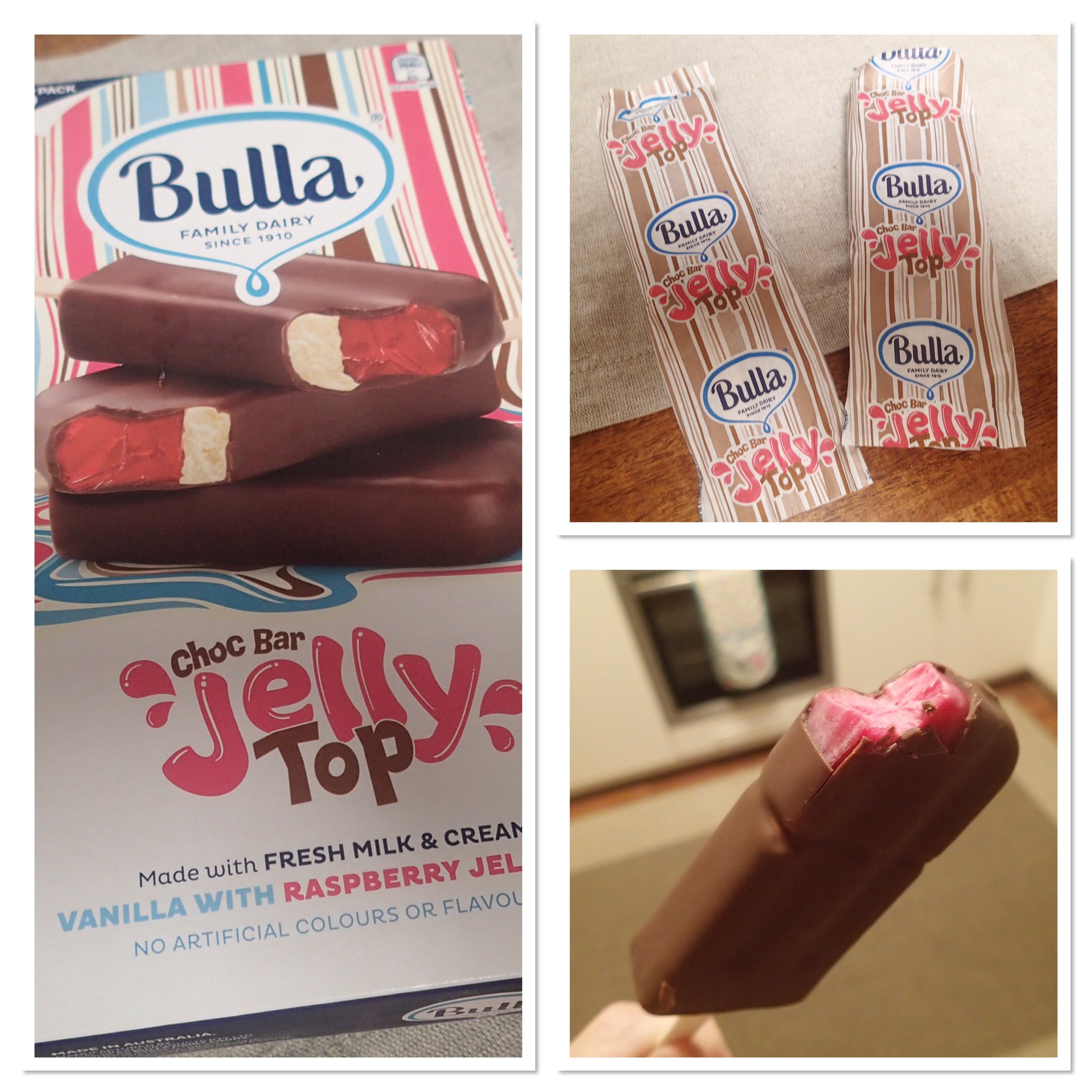 Growing up, one of my favourite ice creams to eat on a hot Summers day was a Jelly Tip. Vanilla icecream, covered in chocolate, with raspberry jelly under the chocolate at the top. Who knows what that jelly was made of, but it was delicious. At some point in my life they disapperead (although I have recently been informed they are still available in New Zealand – can anyone verify this?), which was pretty disappointing, although not quite as disappointing as the death of the Hazelnut Roll (but that’s a story for another time). So when Bulla recently released these icecreams, that looked suspiciously like the Jelly Tip icecreams of my youth, I just had to try them. And the verdict? Not bad at all. Obviously not exactly the same (although my memory is a bit hazy), but pretty good. My fondness for sugary treats like this has declined as I’ve got older (I’d have a wheel of cheese over an icecream any day) but it was still a pretty tasty treat that reminded me of hot Summer days back in the ’80’s.
