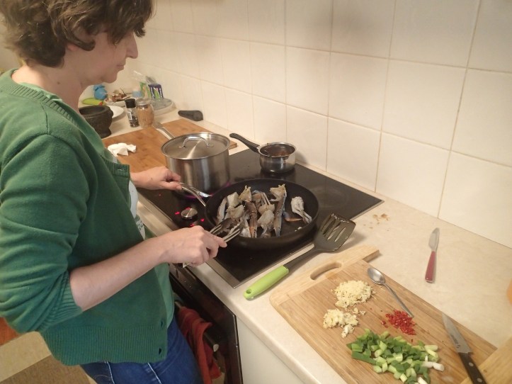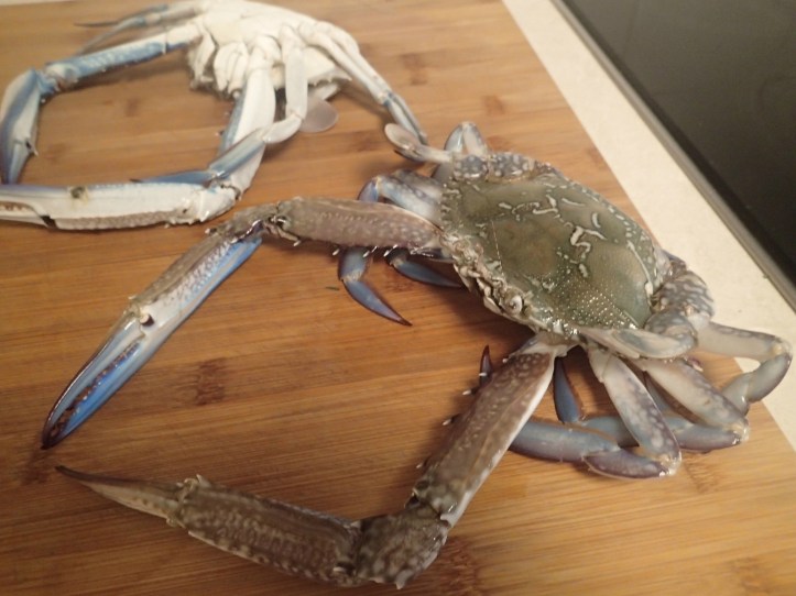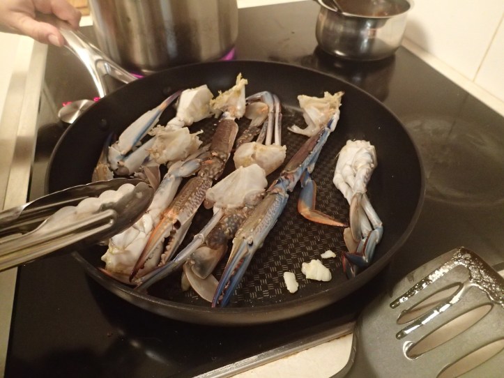 We were buying some seafood at Catalano’s on the weekend and the Blue Swimmer Crabs looked really good and fresh, so we decided to get a couple. I have wanted to try to cook Black Pepper Crab for a while, and now was my chance. I’ve cleaned cooked crabs before, but have never really dealt with raw crabs. Luckily for me,these days we have a handy thing called the Internet which provides handy instructions on how to prepare crabs. Also, I made Steve do it 😄