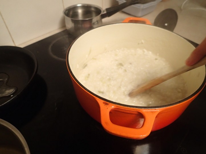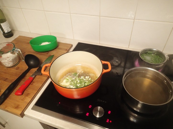 Then the risotto making process begins. The peas were boiled separately, then processed briefly (so they were still a bit chuncky) with some mint before being stirred in to the risotto towards the end of cooking.