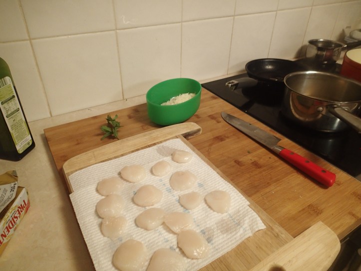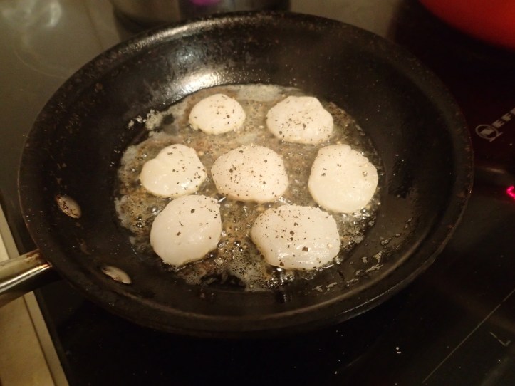 I dried the scallops as much as possible on some kitchen paper before frying them up quickly in some butter.