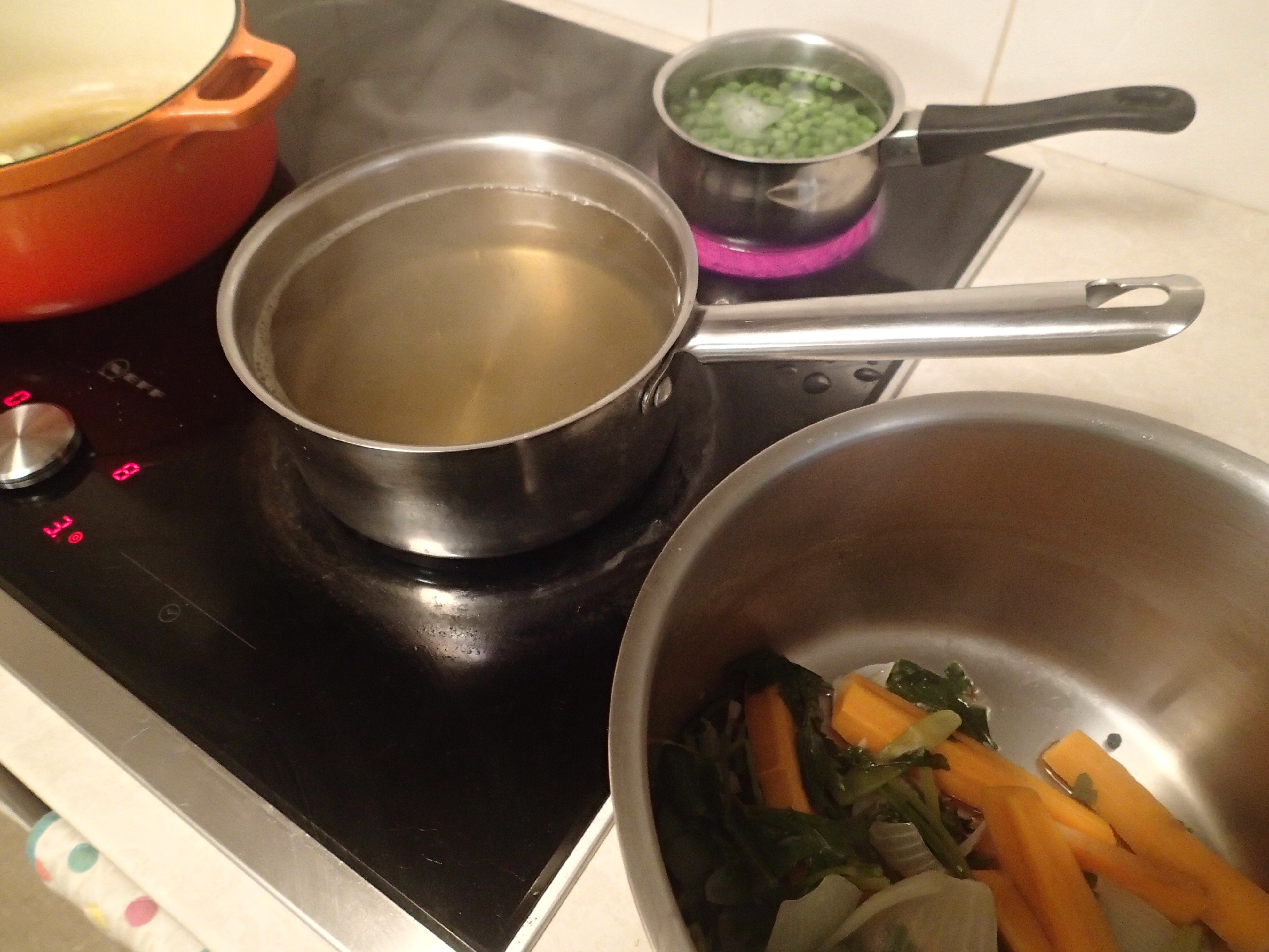 I didn’t have any stock handy, so I quickly scoured the fridge for some random herbs and vegetables, and boiled up a pot of stock.