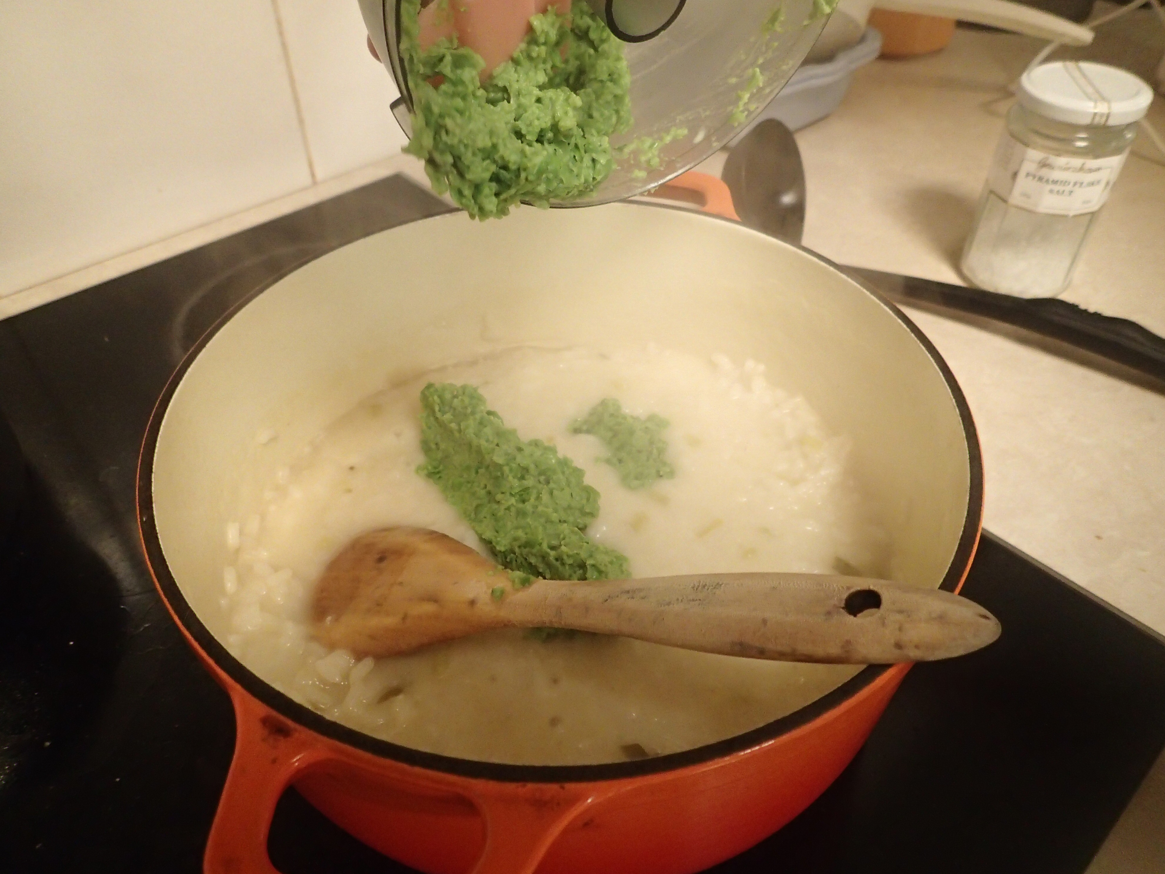Then the risotto making process begins. The peas were boiled separately, then processed briefly (so they were still a bit chuncky) with some mint before being stirred in to the risotto towards the end of cooking.