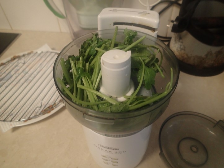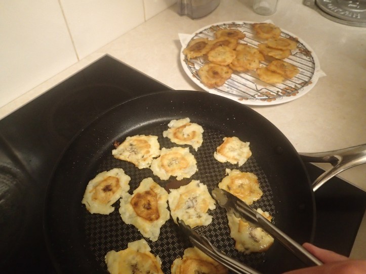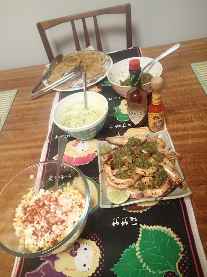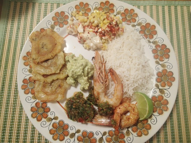I was tired after work, and was just going to cook up some prawns I had in the fridge with some rice. Then I found some plantains in them fridge and decided to cook those too. And some corn. Oh and I’d better make a salsa to go with it all. Before I knew it, there was a whole Mexican feast. The corn was especially delicious – cooked in butter with a bit of salt, pepper and oregano then topped with feta, mayonnaise and paprika – sooooo good!