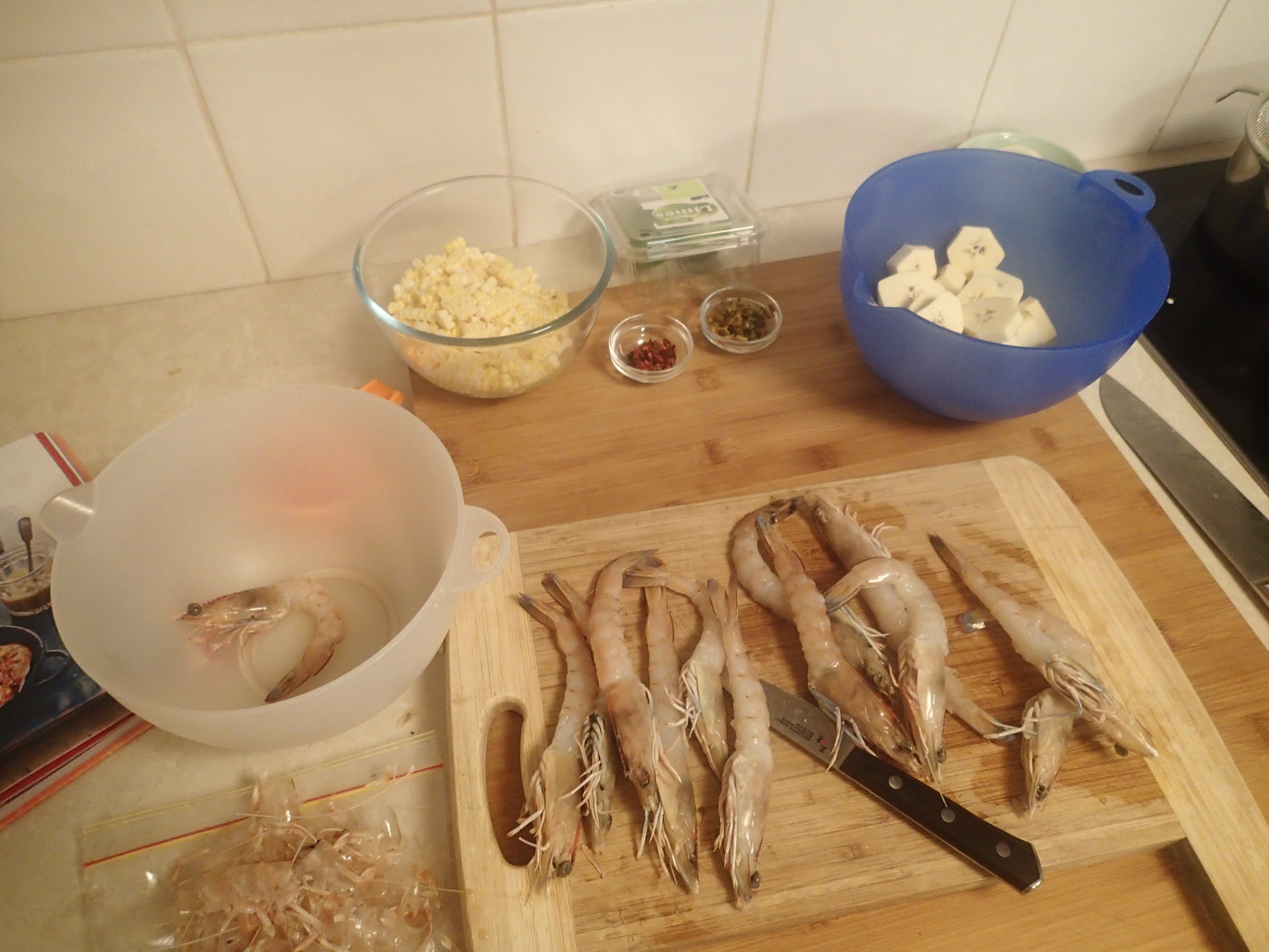I was tired after work, and was just going to cook up some prawns I had in the fridge with some rice. Then I found some plantains in them fridge and decided to cook those too. And some corn. Oh and I’d better make a salsa to go with it all. Before I knew it, there was a whole Mexican feast. The corn was especially delicious – cooked in butter with a bit of salt, pepper and oregano then topped with feta, mayonnaise and paprika – sooooo good!