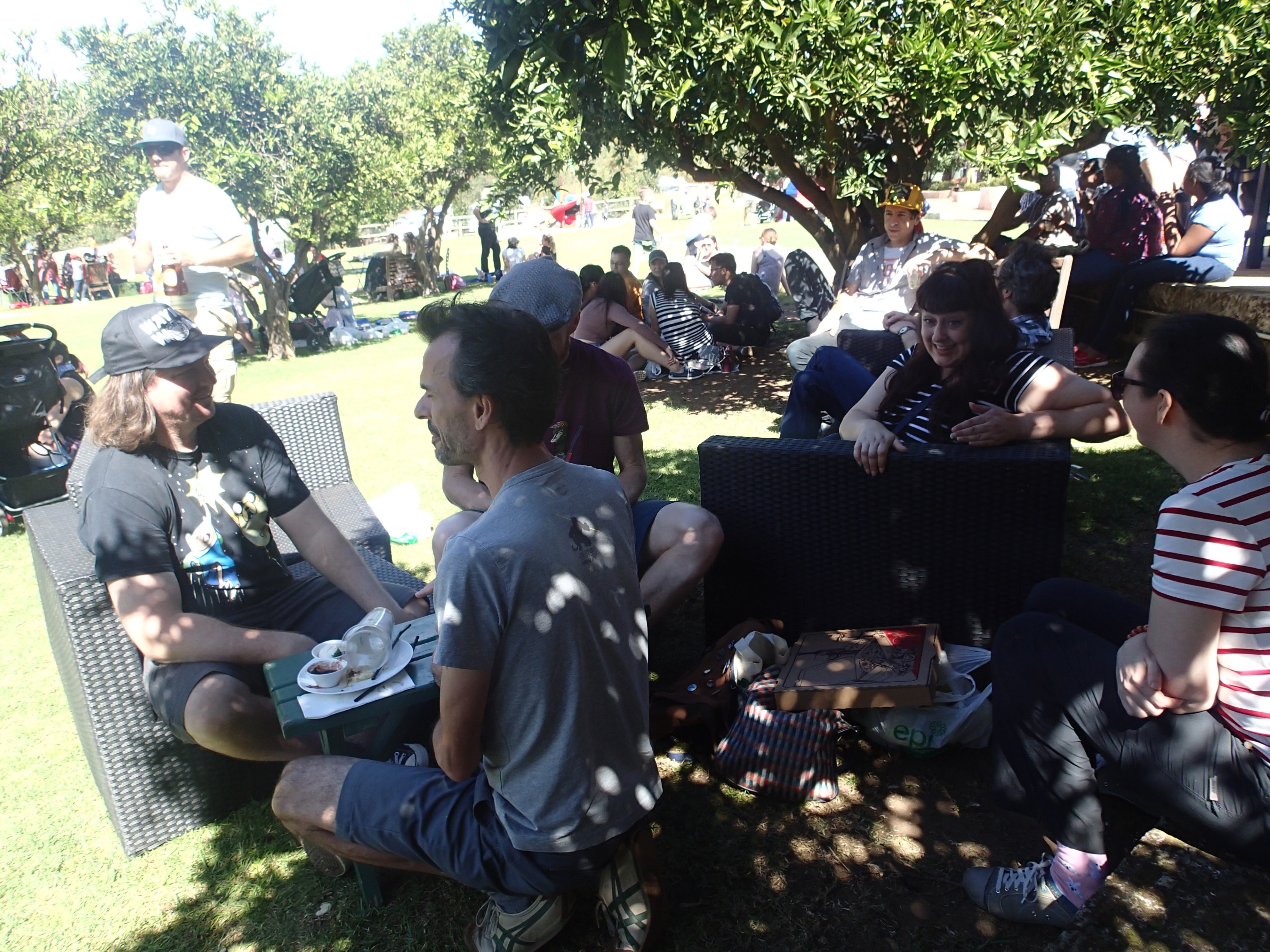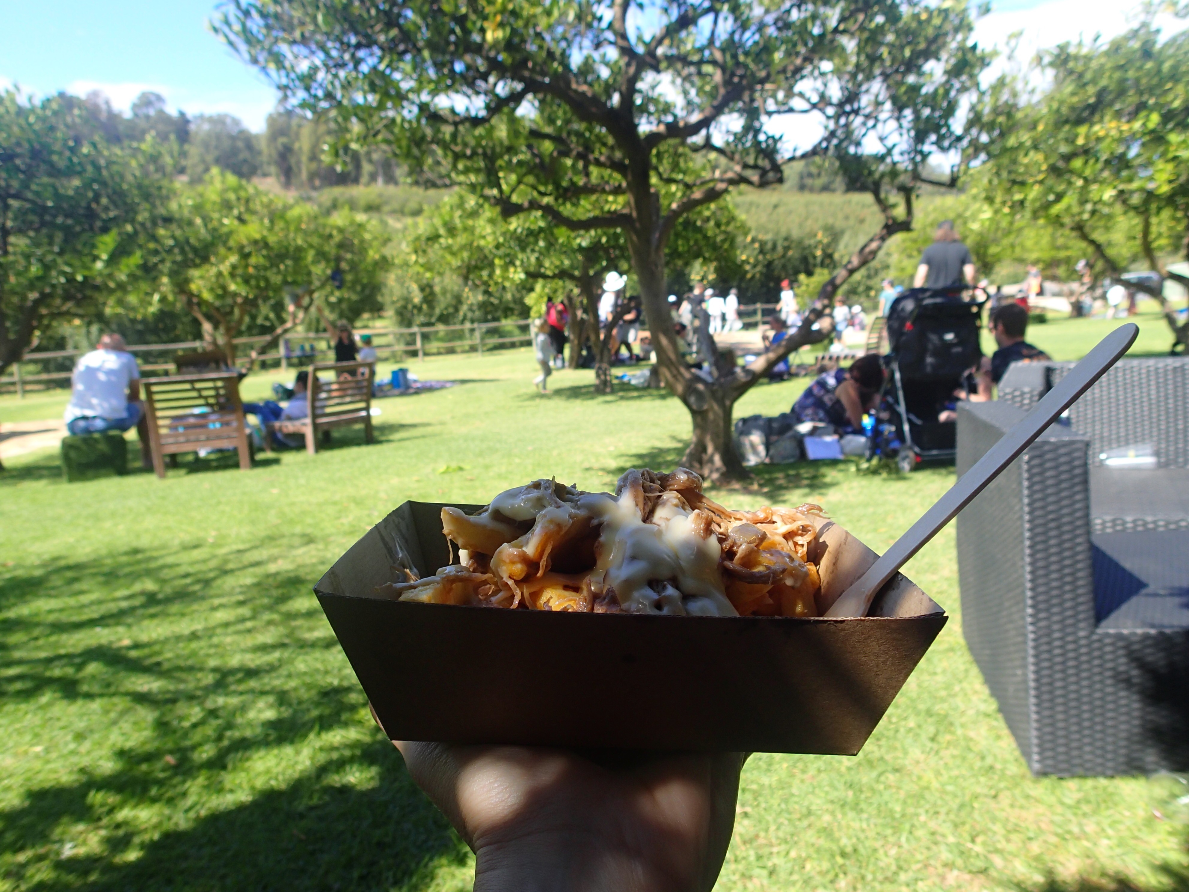 After a while we got a bit hungry. I sent Steve off to buy some chips – he ordered the “loaded” fries, which were covered in pulled pork. Quite delicious.