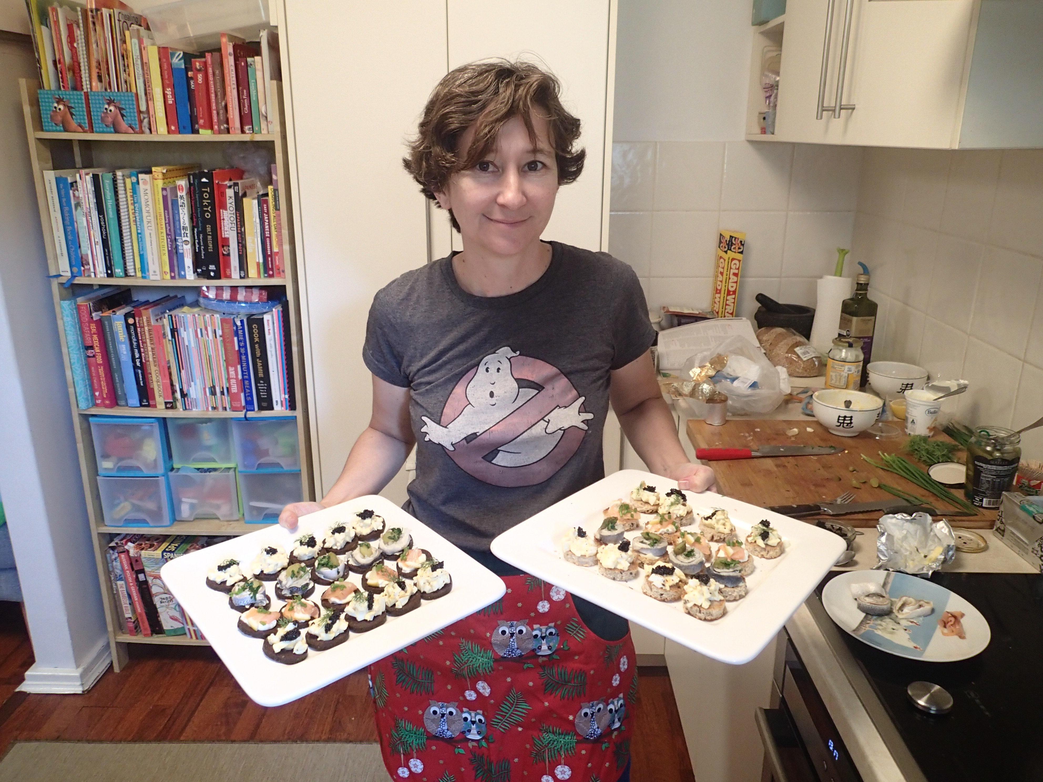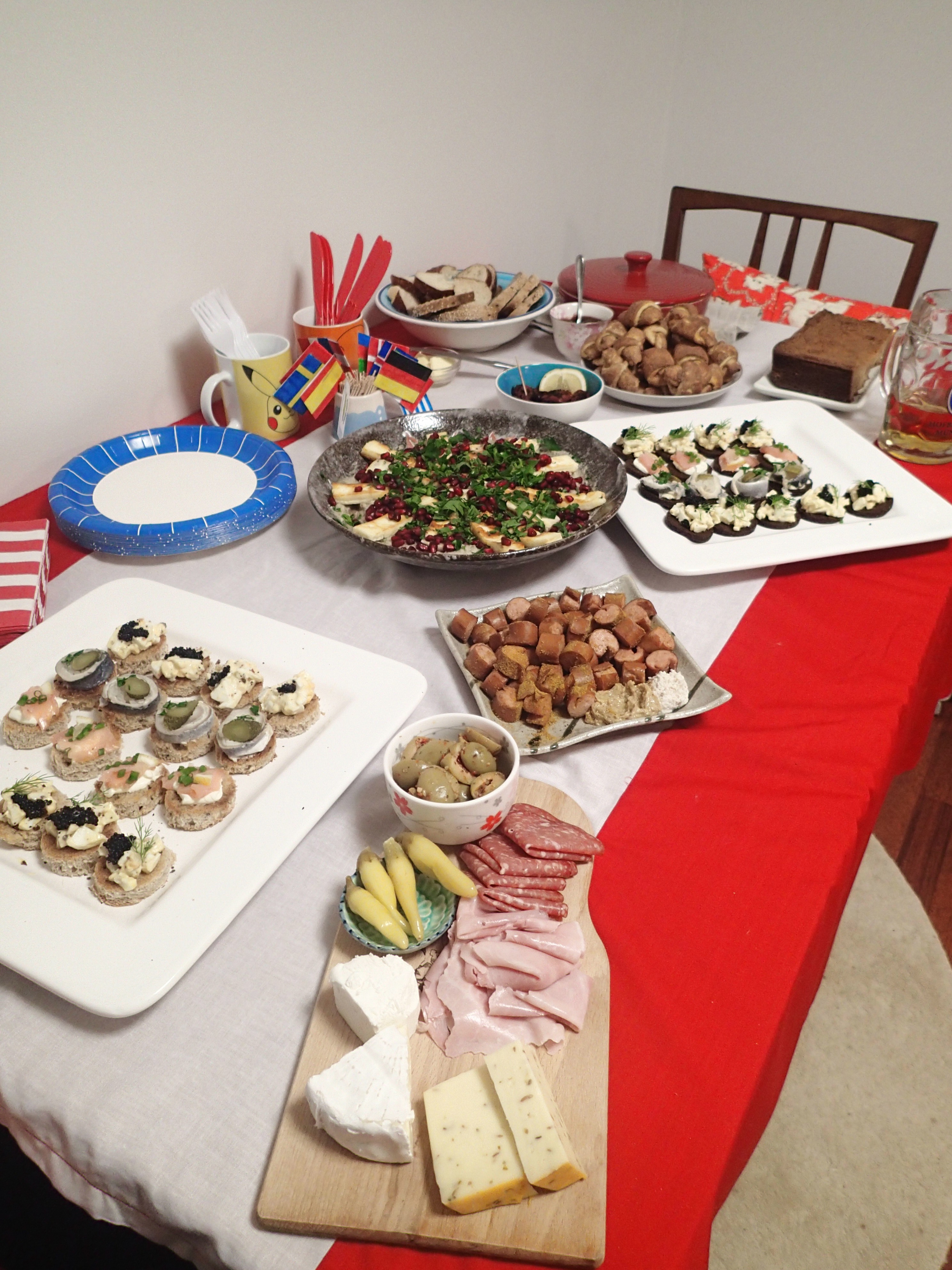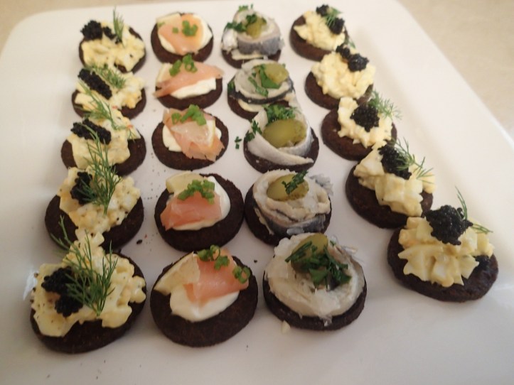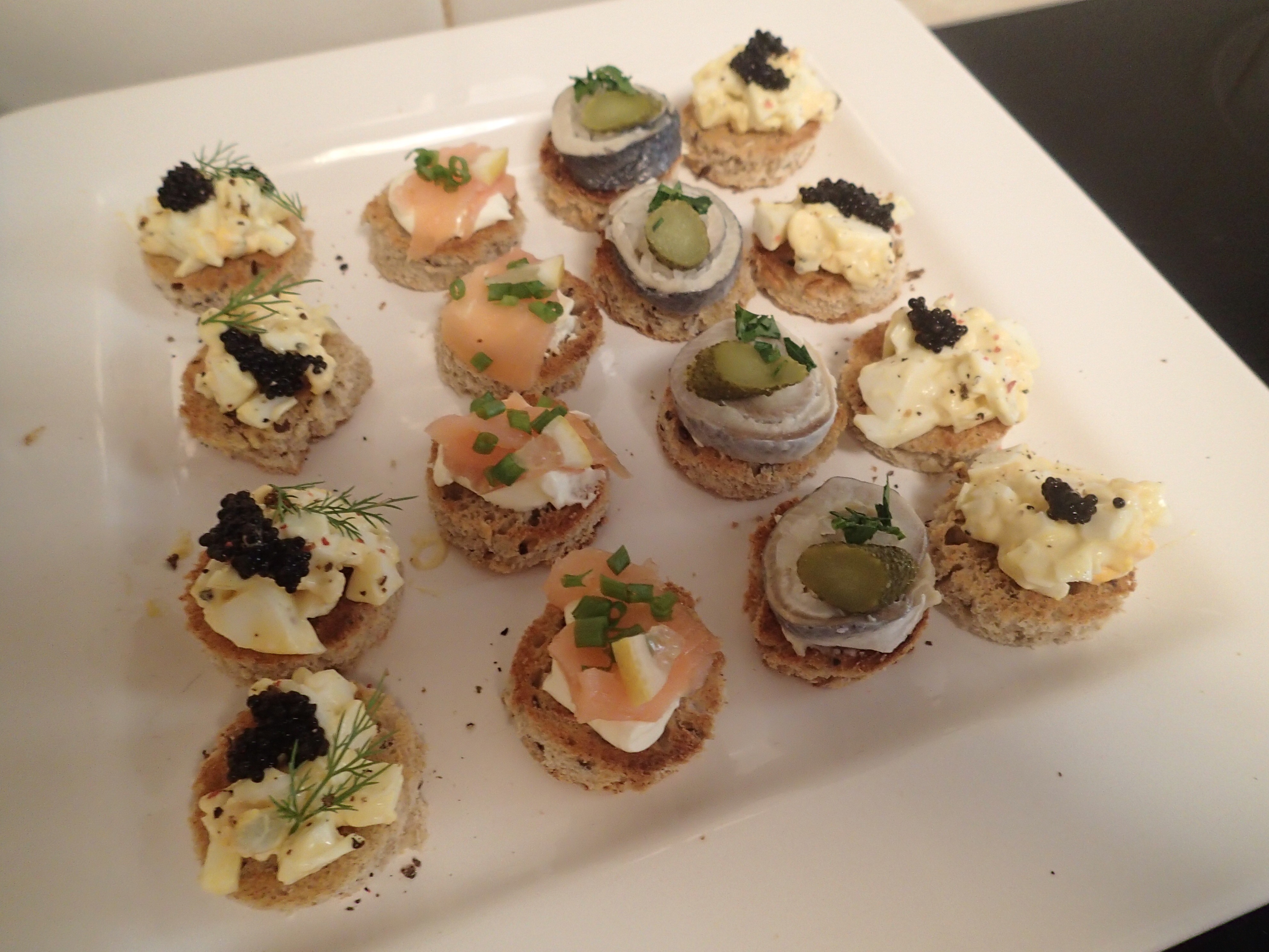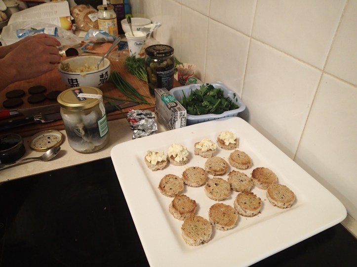 On Sunday, I started prepping around midday. I made Smørrebrød with pumpernickel and pretend Smørrebrød with normal bread, because Steve seems to be allergic to pumpernickel and some people just don’t like it. I cut rounds out of the bread and toasted them under the grill. The Smørrebrød featured salmon & sour cream, egg,dill & mayonnaise and rollmops. Yum!