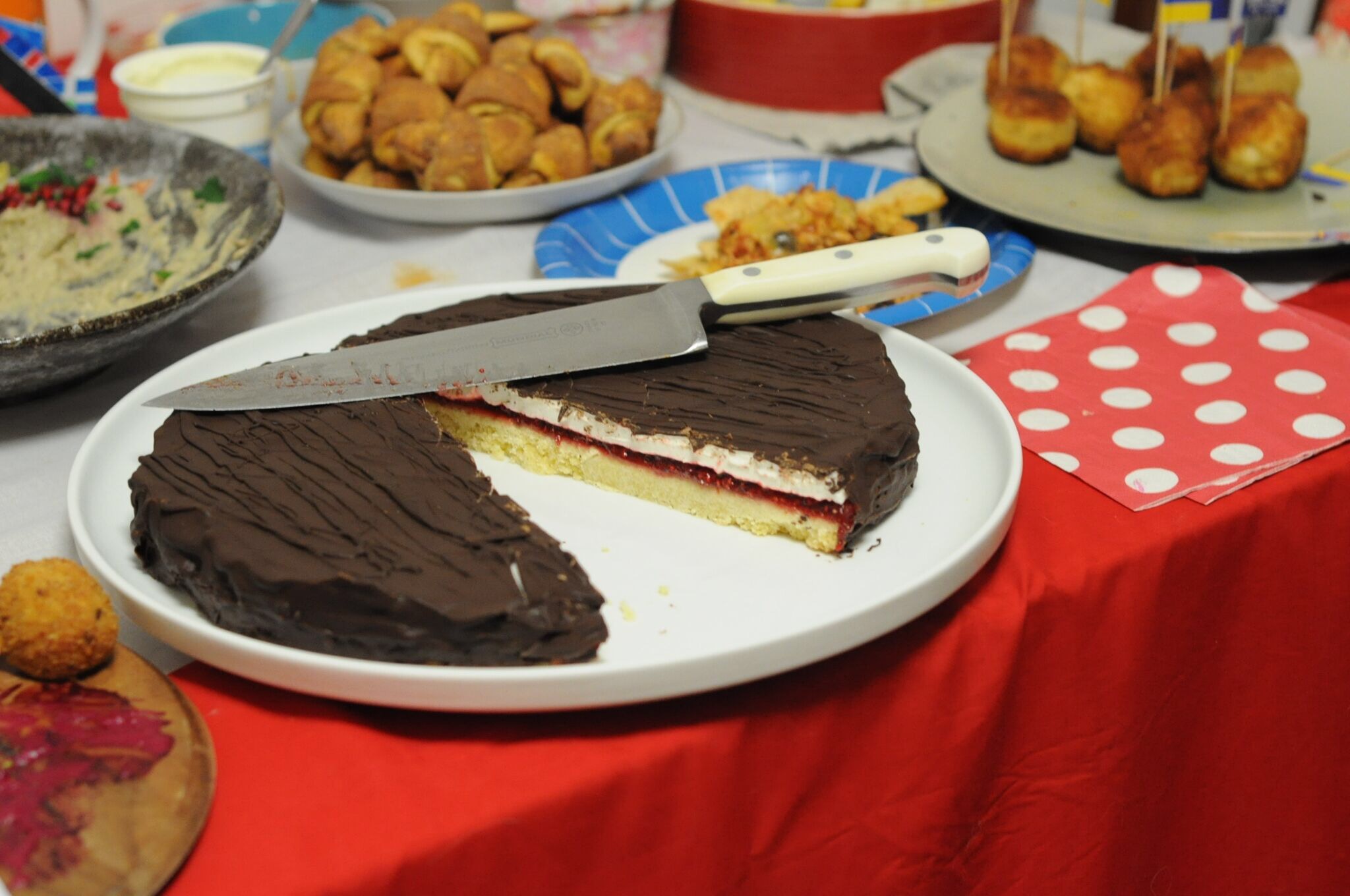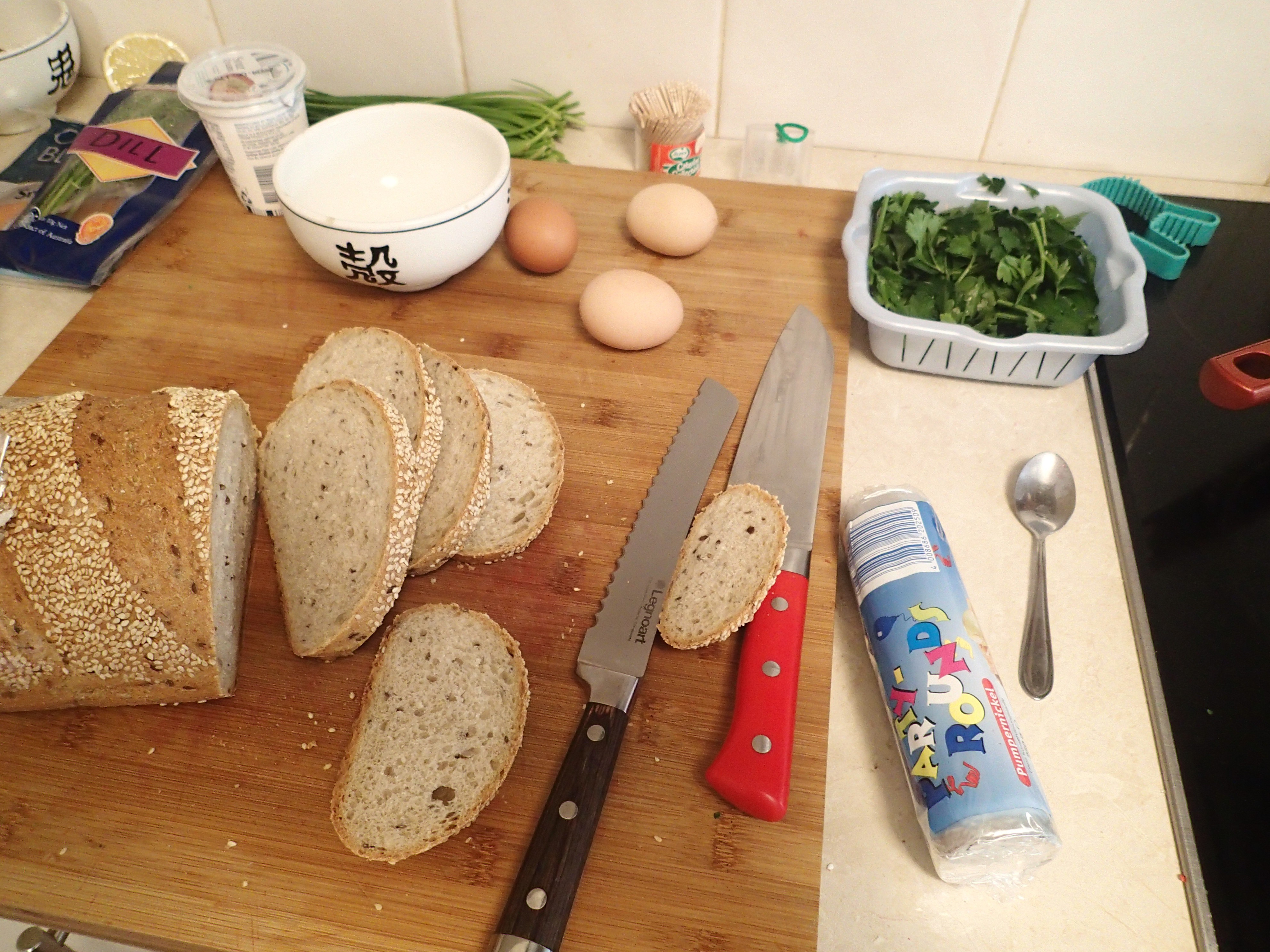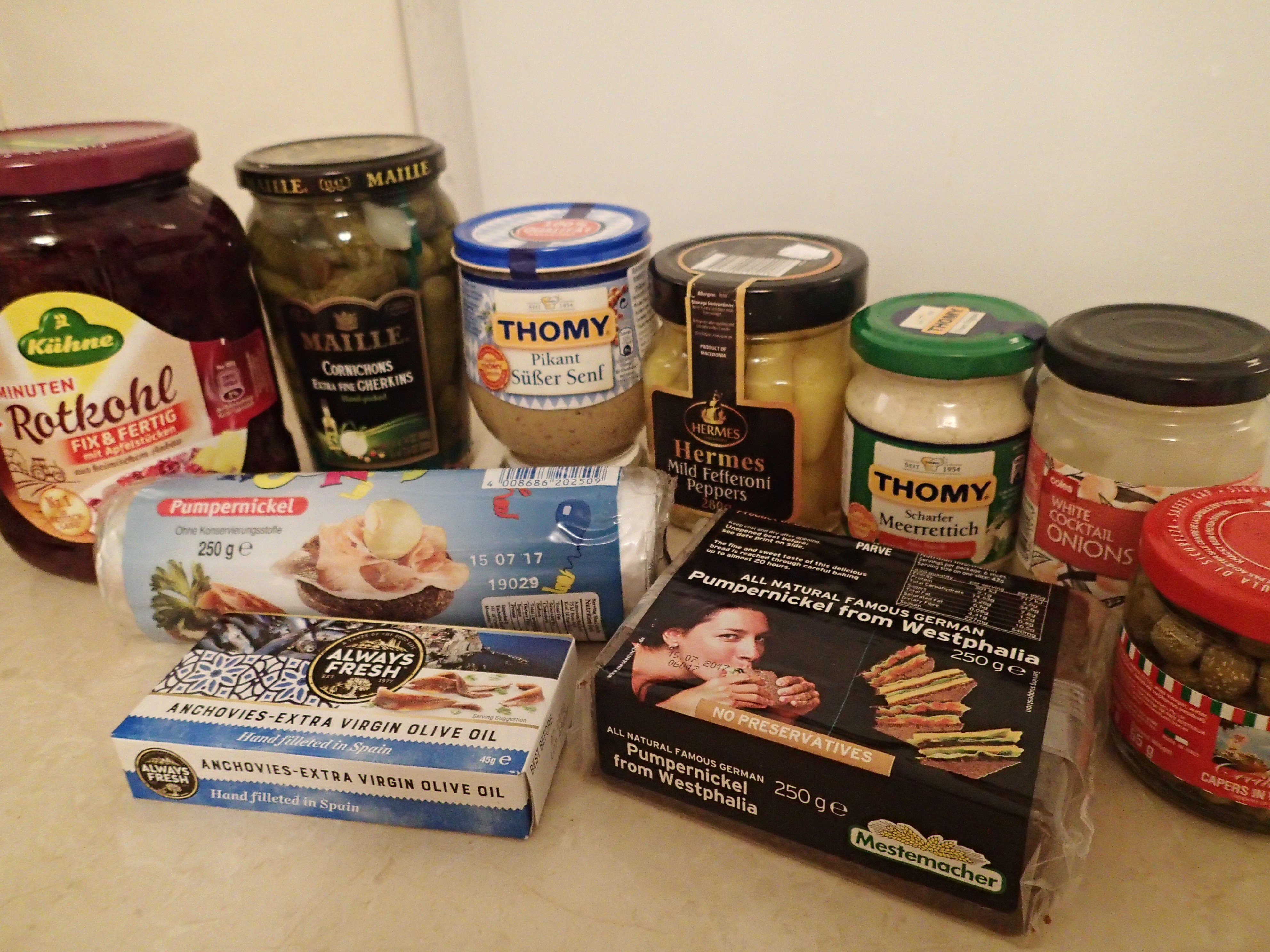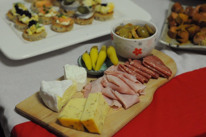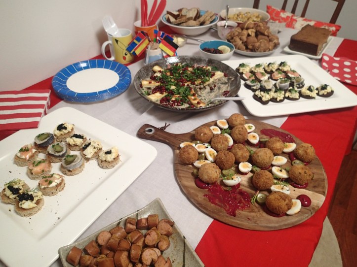 On Sunday, I started prepping around midday. I made Smørrebrød with pumpernickel and pretend Smørrebrød with normal bread, because Steve seems to be allergic to pumpernickel and some people just don’t like it. I cut rounds out of the bread and toasted them under the grill. The Smørrebrød featured salmon & sour cream, egg,dill & mayonnaise and rollmops. Yum!