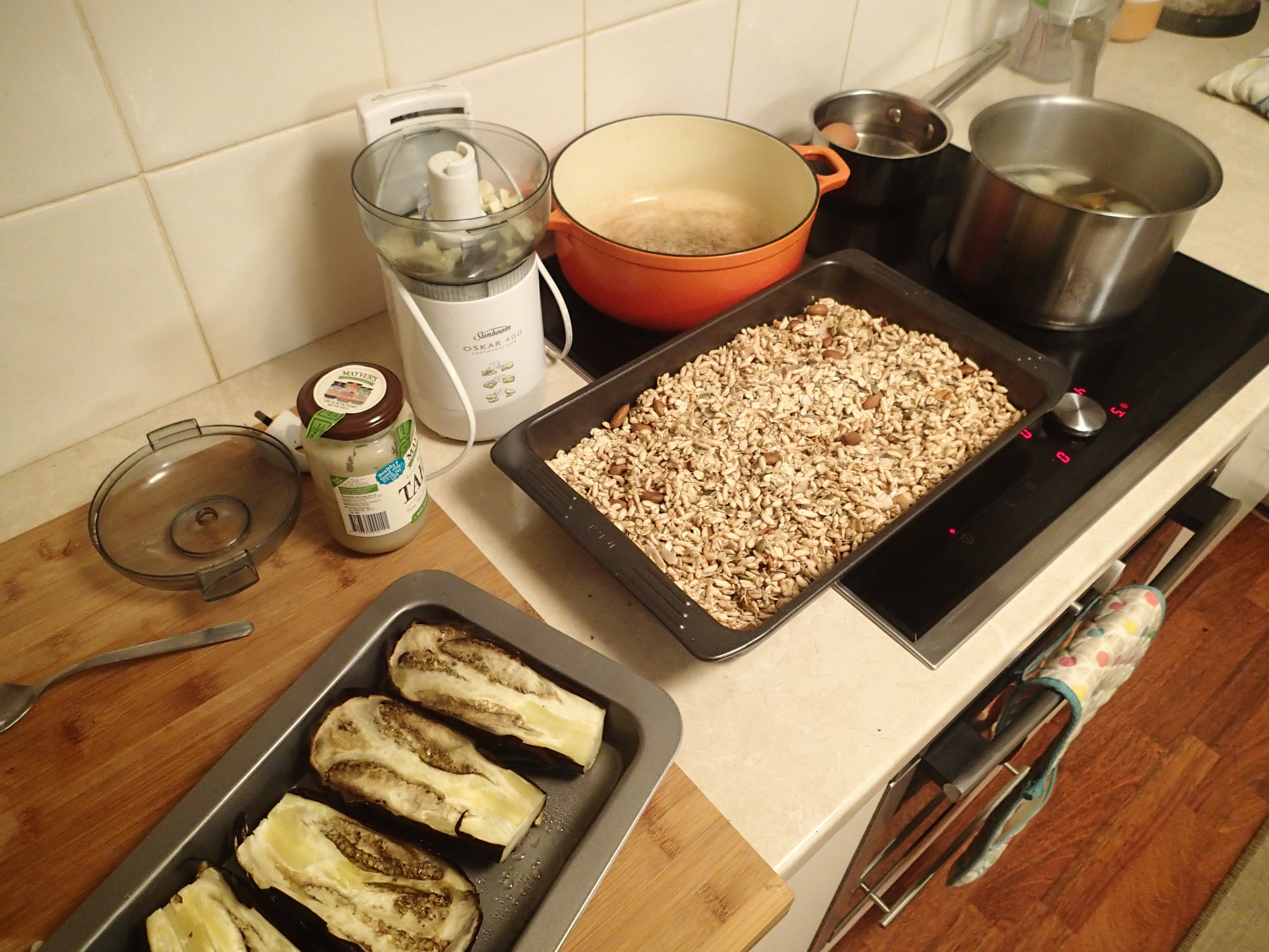 Preparations began on Saturday. Here I amd prepping the Babaganoush (whilst making vegetable stock for dinner and muesli for my breakfasts)