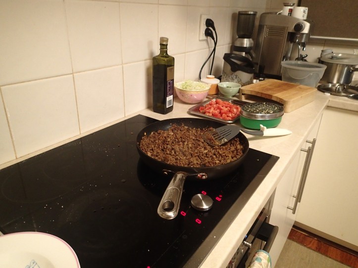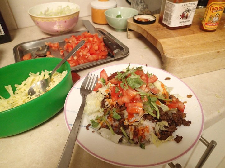 In between batches of cupcakes, I made us Taco Rice for dinner. Multi tasking at its finest.