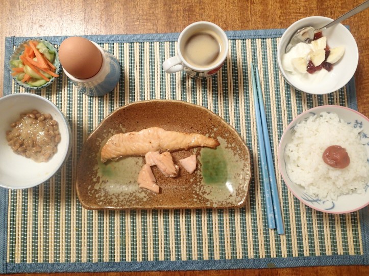 Rice with Umeboshi, grilled salmon, soft boiled egg, pickles and yogurt with (homemade) plum jam. Oh and coffee of course. Breakfast of champions.