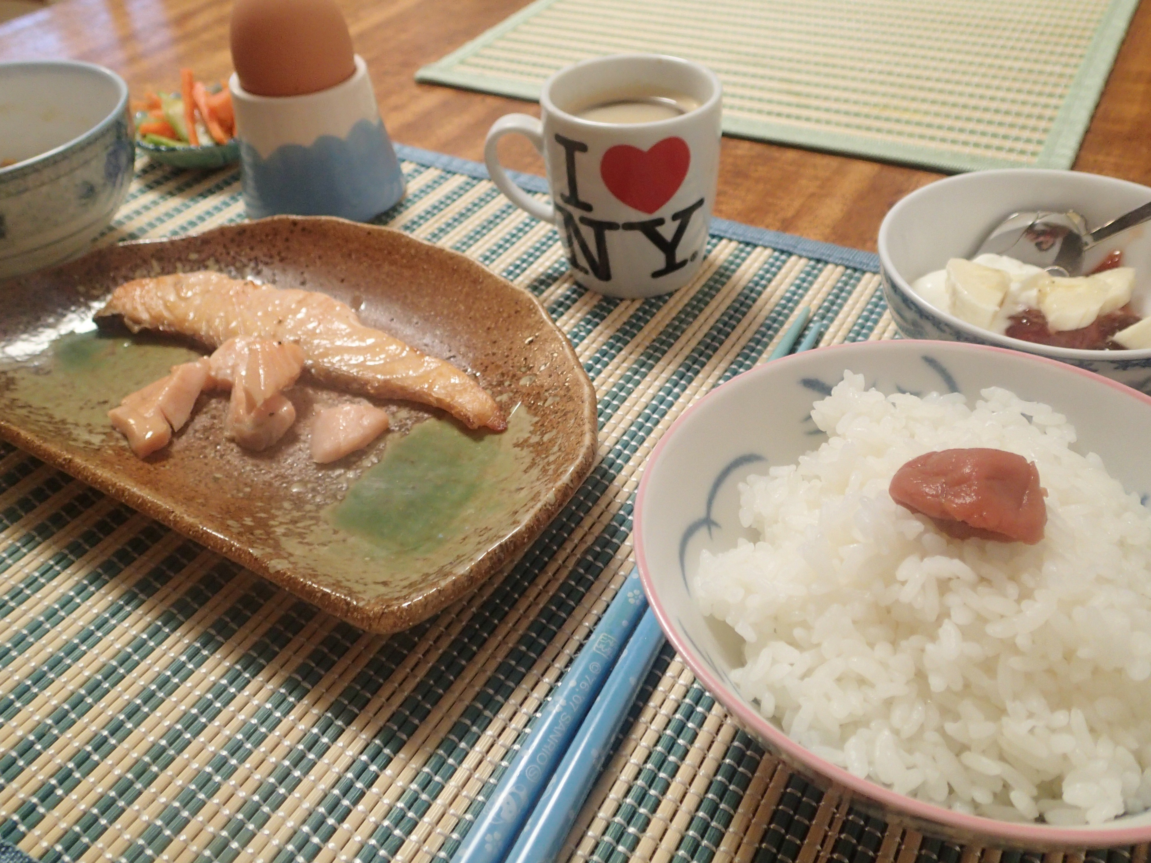 Rice with Umeboshi, grilled salmon, soft boiled egg, pickles and yogurt with (homemade) plum jam. Oh and coffee of course. Breakfast of champions.
