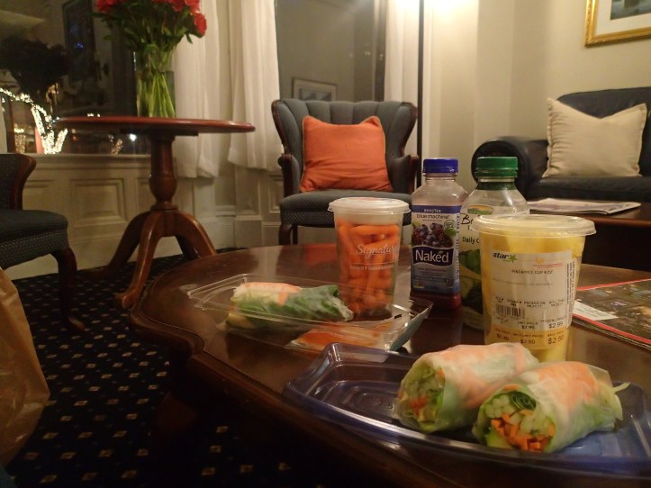 When dinner time came around, it was time for a very light meal from the supermarket of some Summer Rolls, Veges and dip and fruit which we ate in the foyer of our hotel like weirdos.