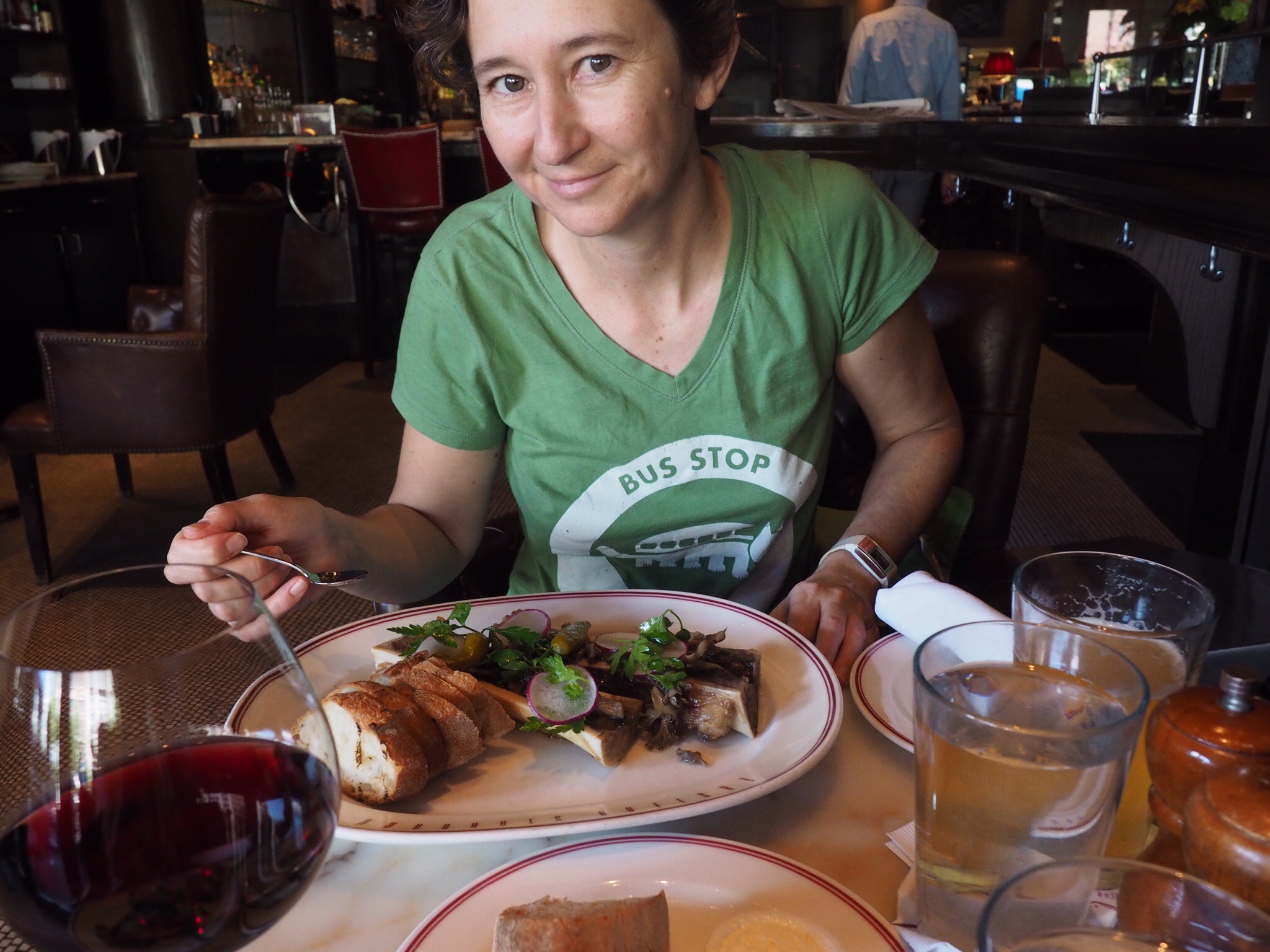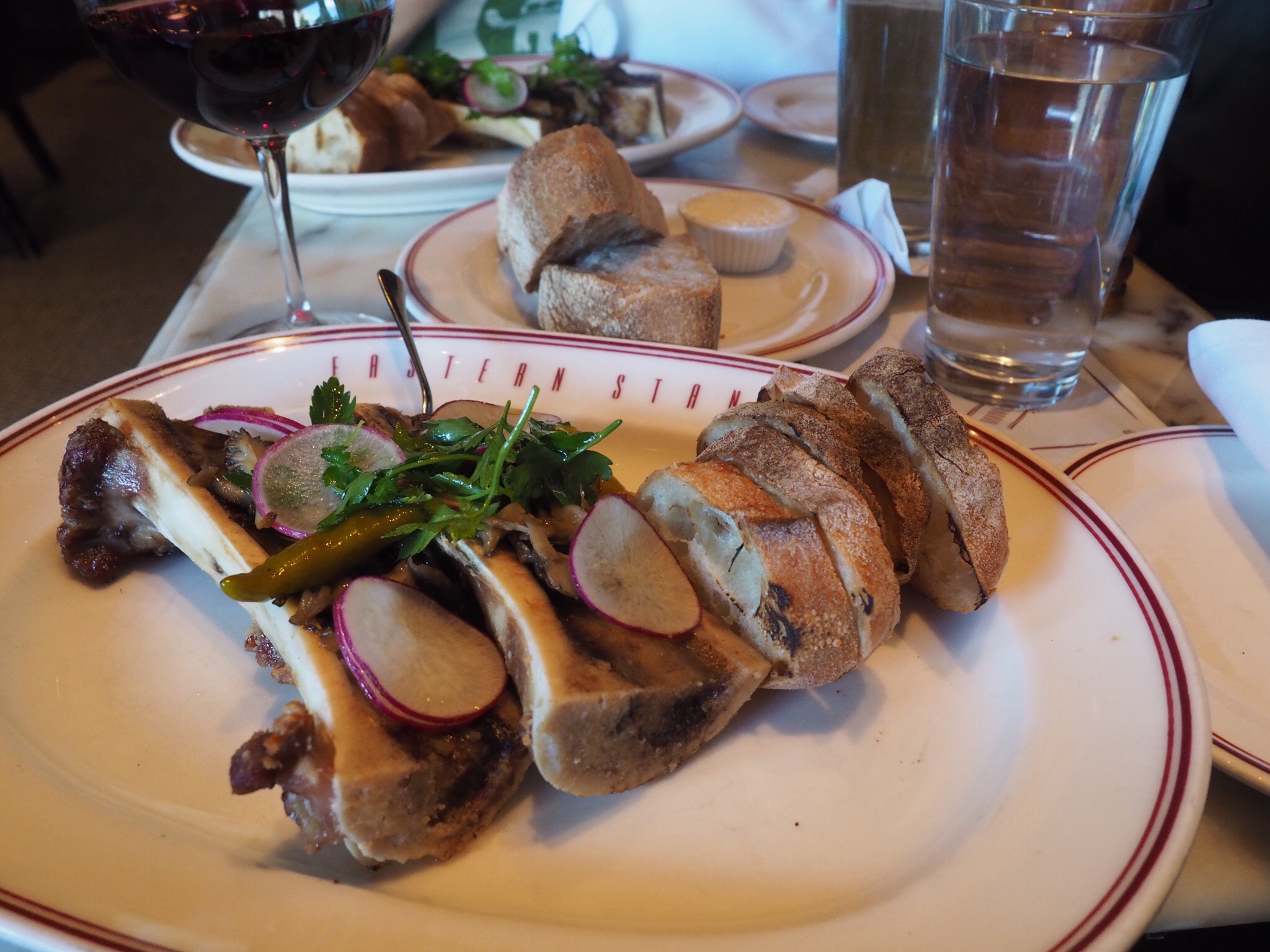 After a bit more of a wander around it was lunch time, so we headed to Eastern Standard for some eats. It was on my list of places to go to because it serves bone marrow. It was a cool place, kind of Viennese cafe meets dive bar or something. Anyway it had a great vibe, so we settled in with a couple of drinks – I had a Von Trappe Pilsner from Vermont, which I enjoyed very much and Steve had a Pinot Noir from Oregon. We both ordered the Bone Marrow for starters and it did not disappoint.