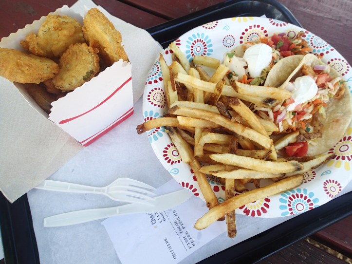 On Monday, we drove back to Boston – where we were flying to Chicago from. We saw more green rolling hills and stopped for lunch in the town of Gill at a place called The Wagon Wheel. We ate fish tacos and fried pickles. The tacos and pickles were good, but the chips were very disappointing.
