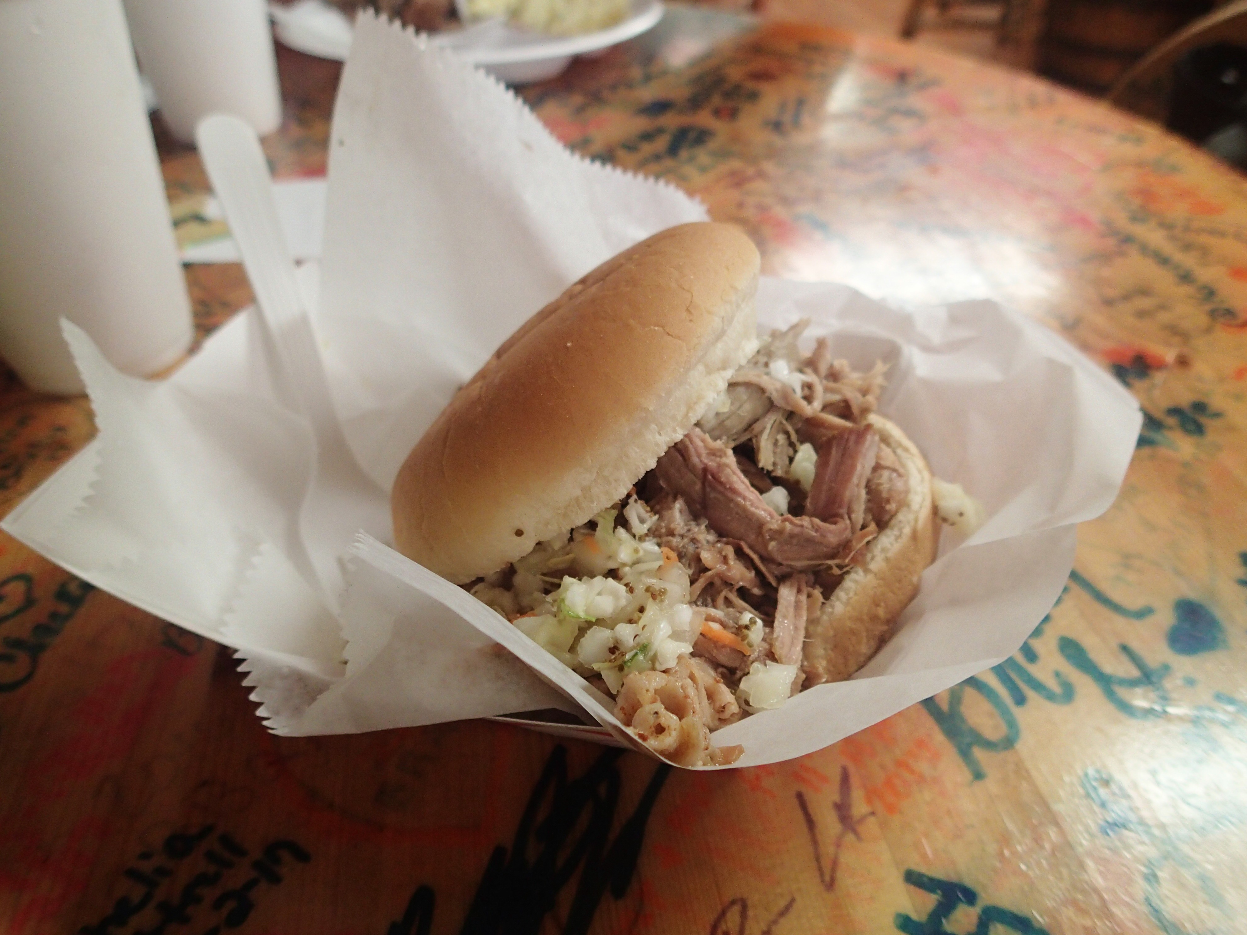 We waited, because BBQ. It wasn’t that long a wait anyway. We had pulled pork sandwiches. And large cups of icy water. Delicious.