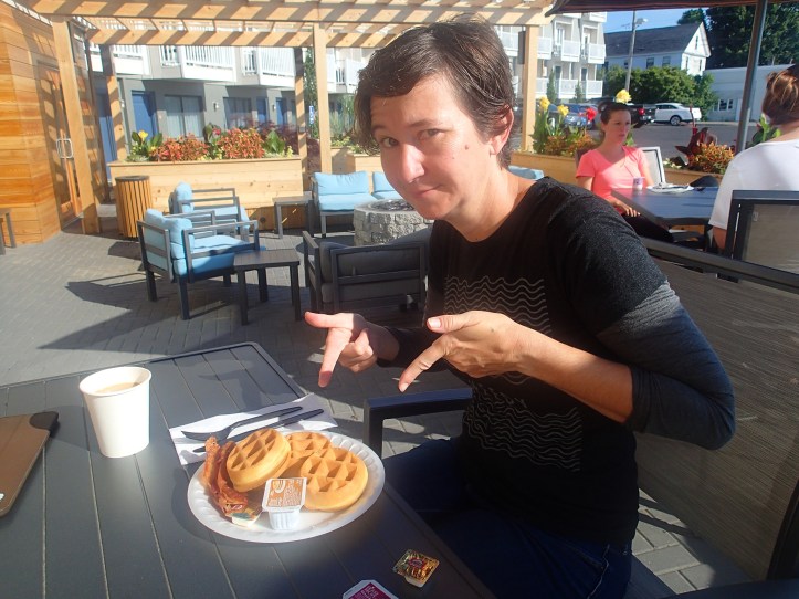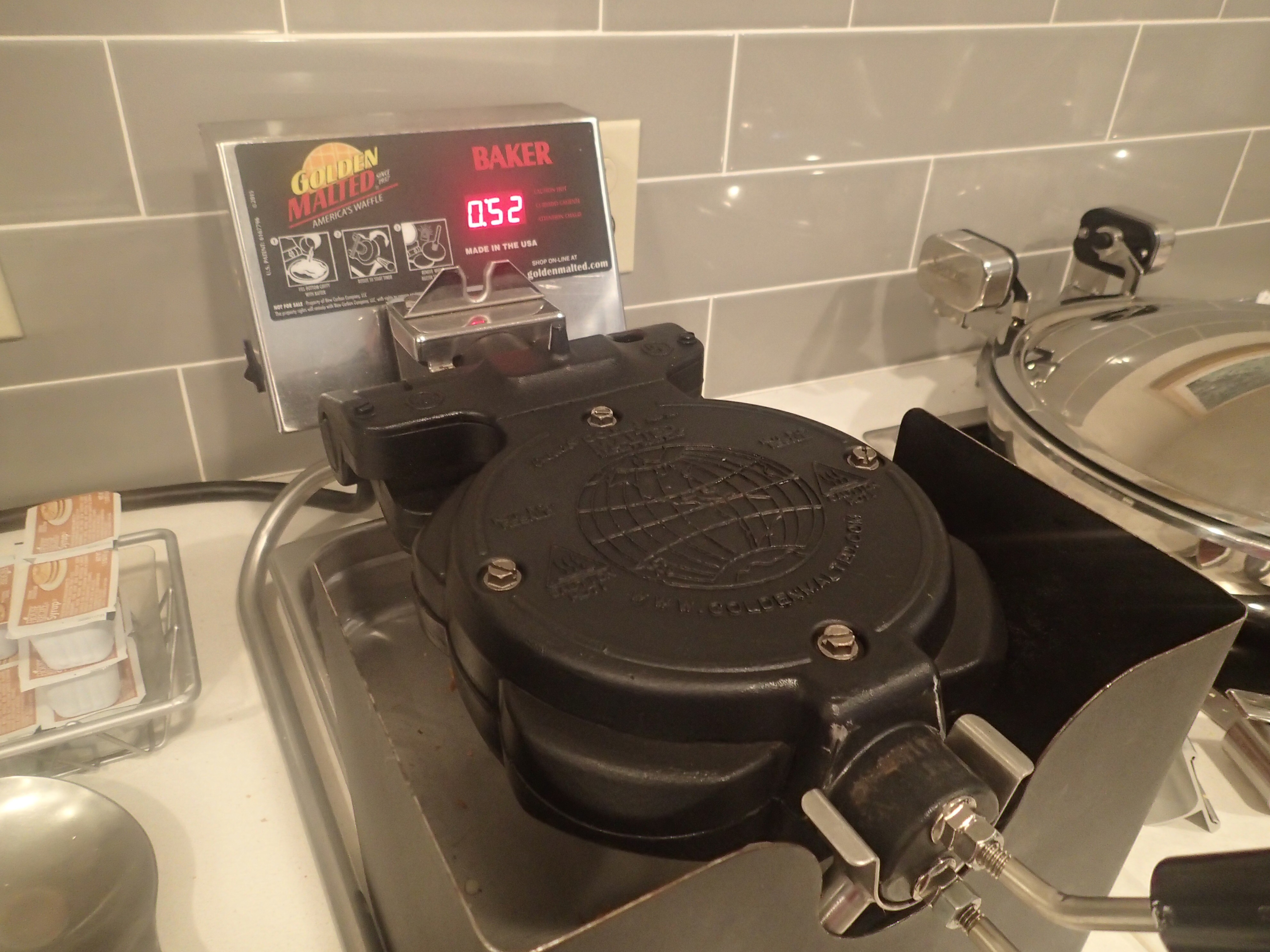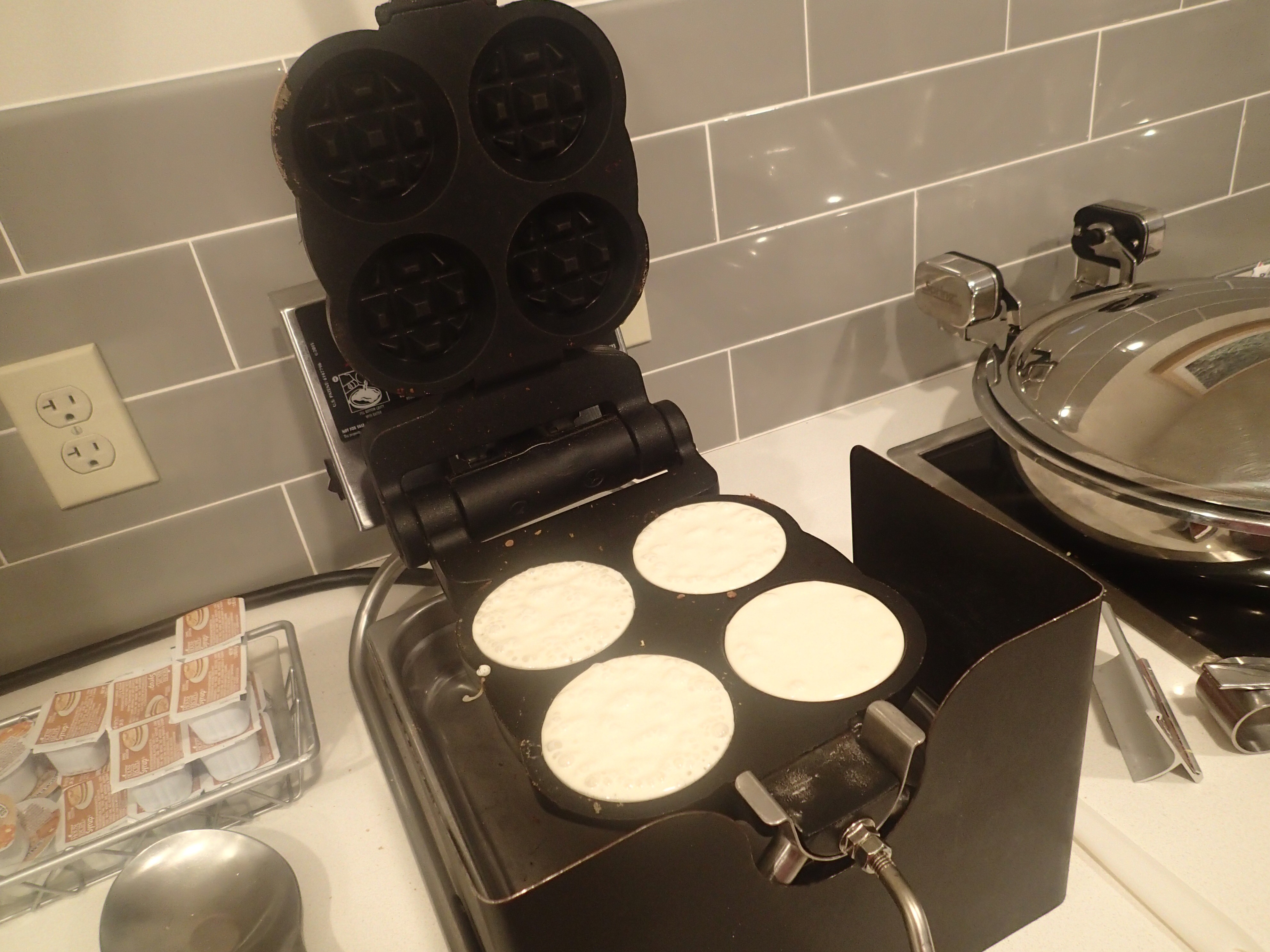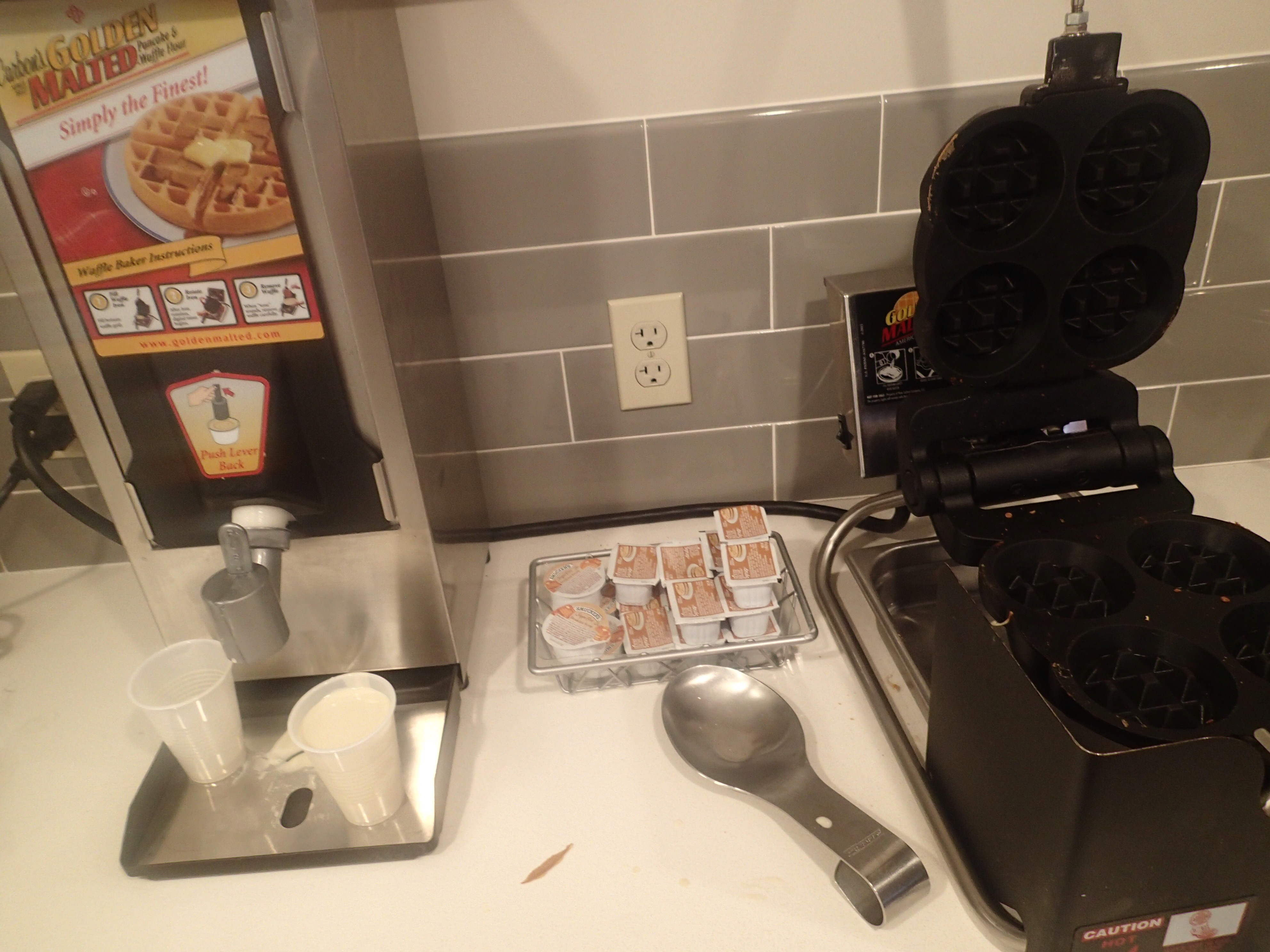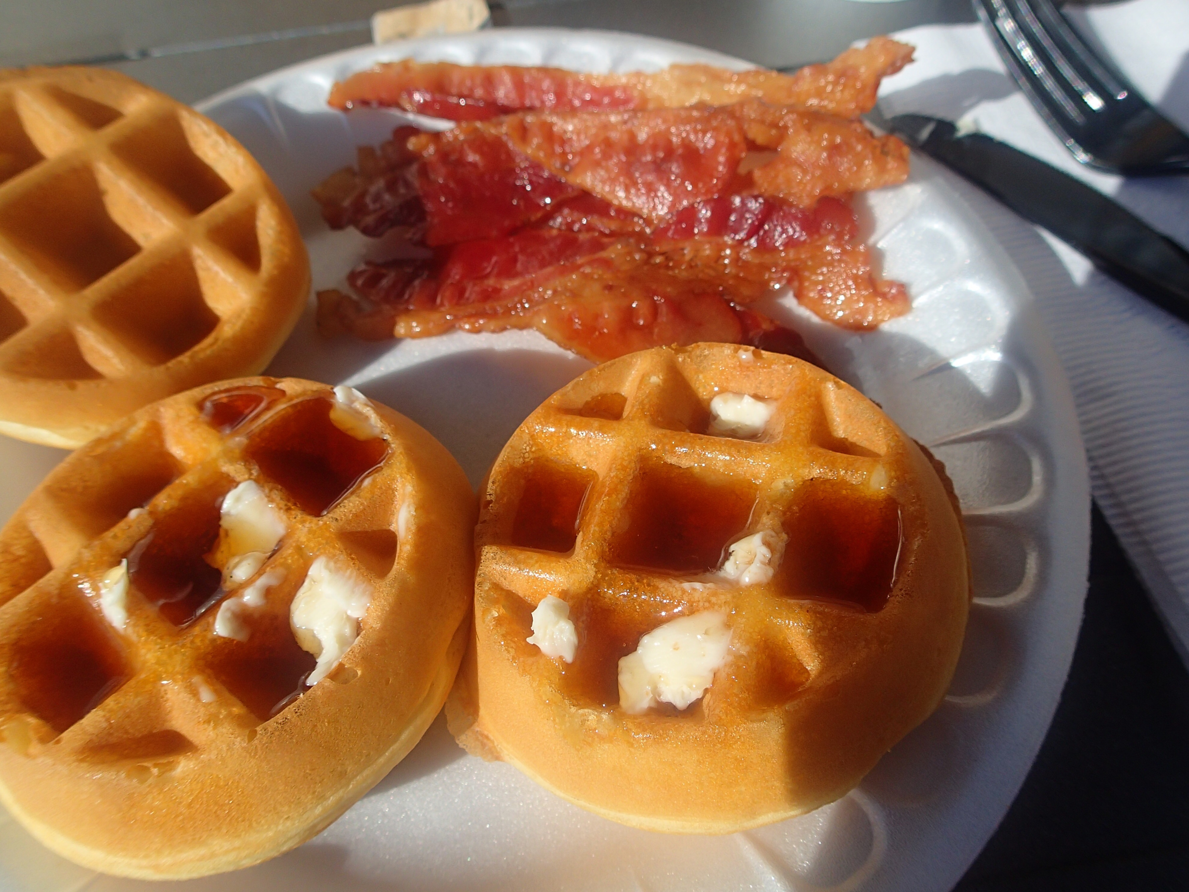 Today for breakfast I made waffles with the waffle making machine at the hotel buffet. And I ate them with syrup and bacon. And loved it.