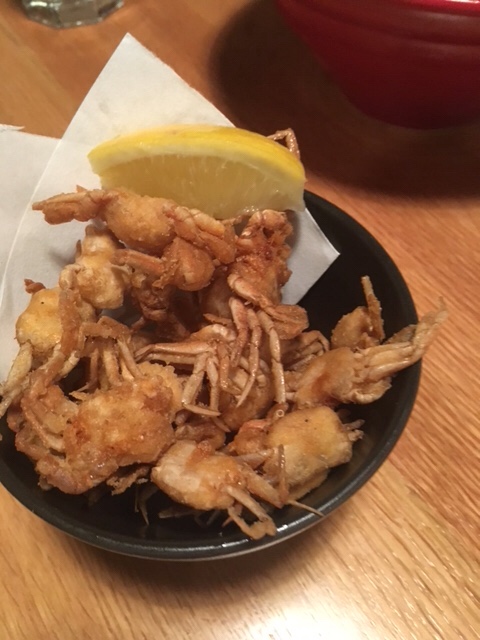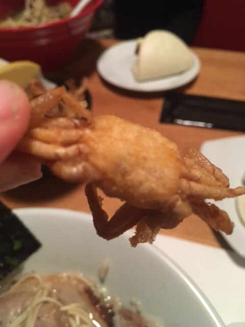 We were let in and got to sit in a booth which was nice. I’d already checked out the menu online so pretty much knew what I wanted, but had another look just in case. I decided on the Shiromaru ramen with an extra side of chashuu and egg (how predictable). I also couldn’t resist ordering the Crispy baby crabs. Poor little baby crabs. But they shouldn’t be so delicious.