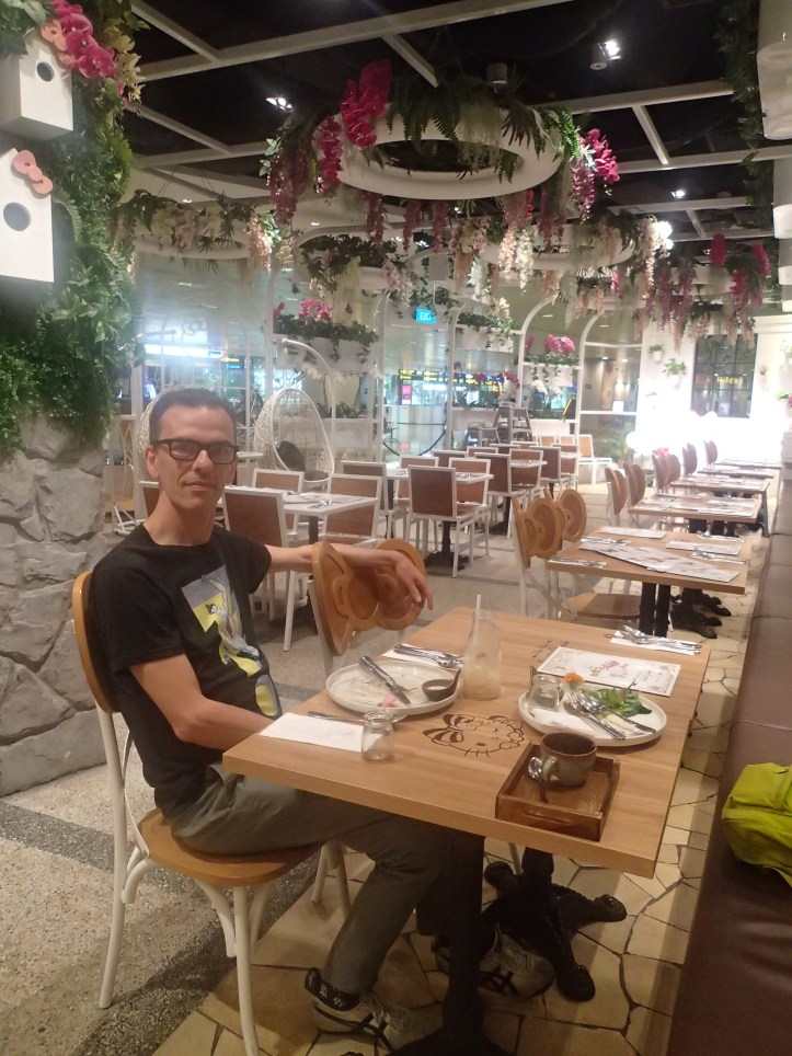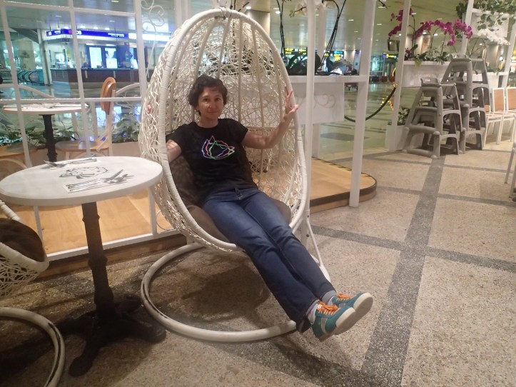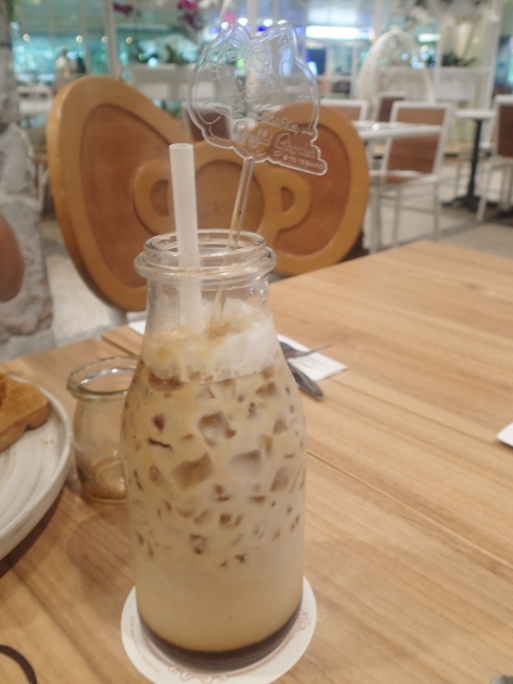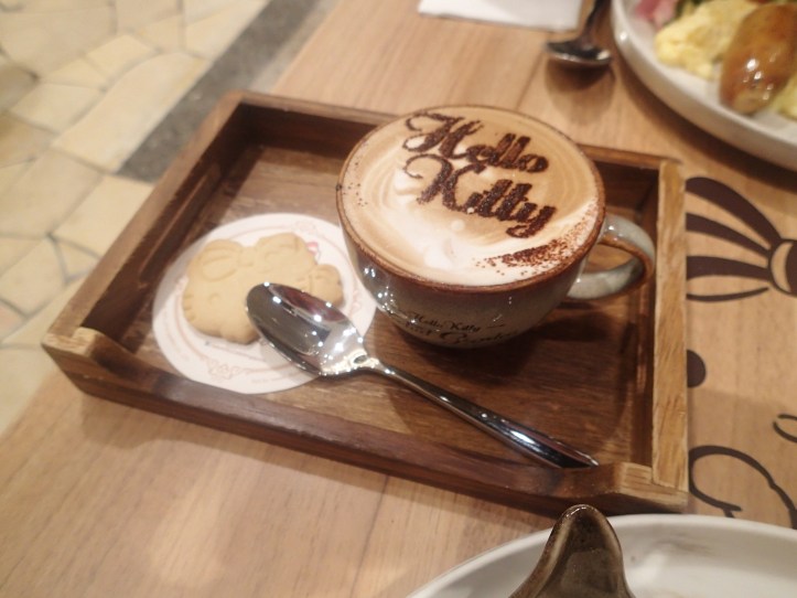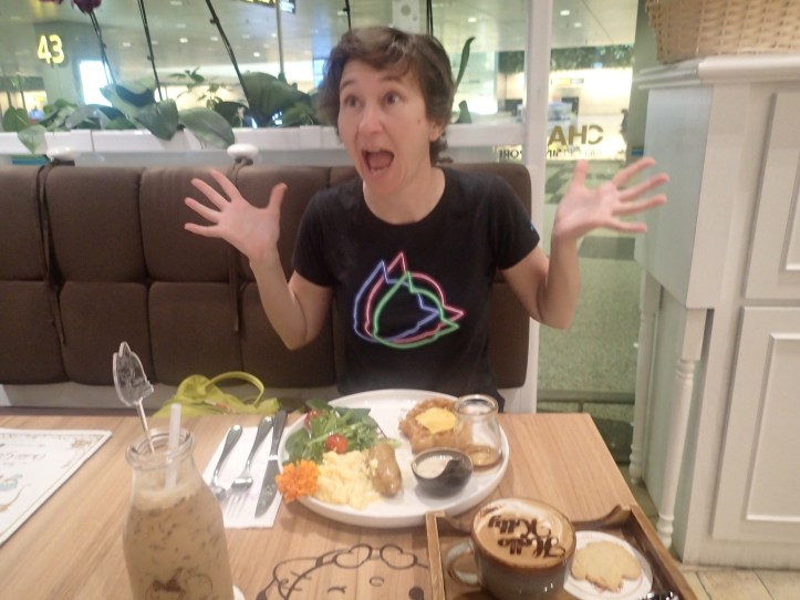 Everything was beautifully themed and super cute. The prices on the menu though were a bit of a shock! I guess we were in Singapore, at the airport, at a theme cafe, so it was never going to be cheap. We both chose the “big breakfast” and I got a cappuccino and Steve got a cold flavoured coffee – I can’t remember what flavour it was though, possibly caramel.