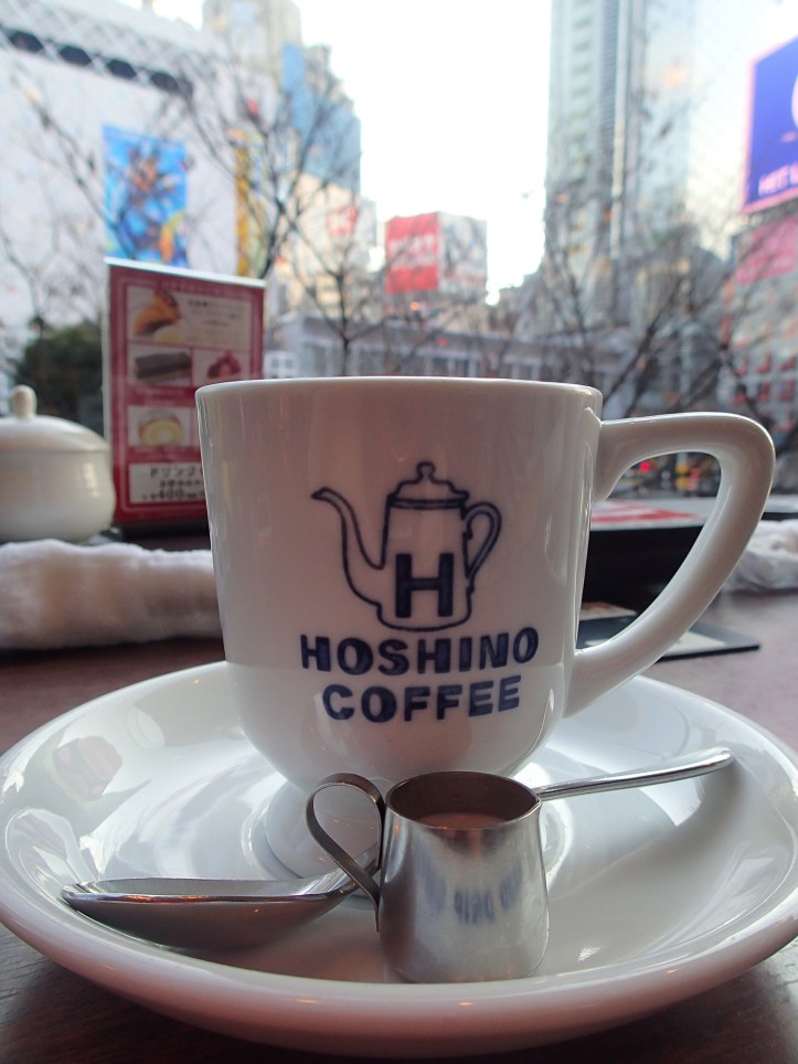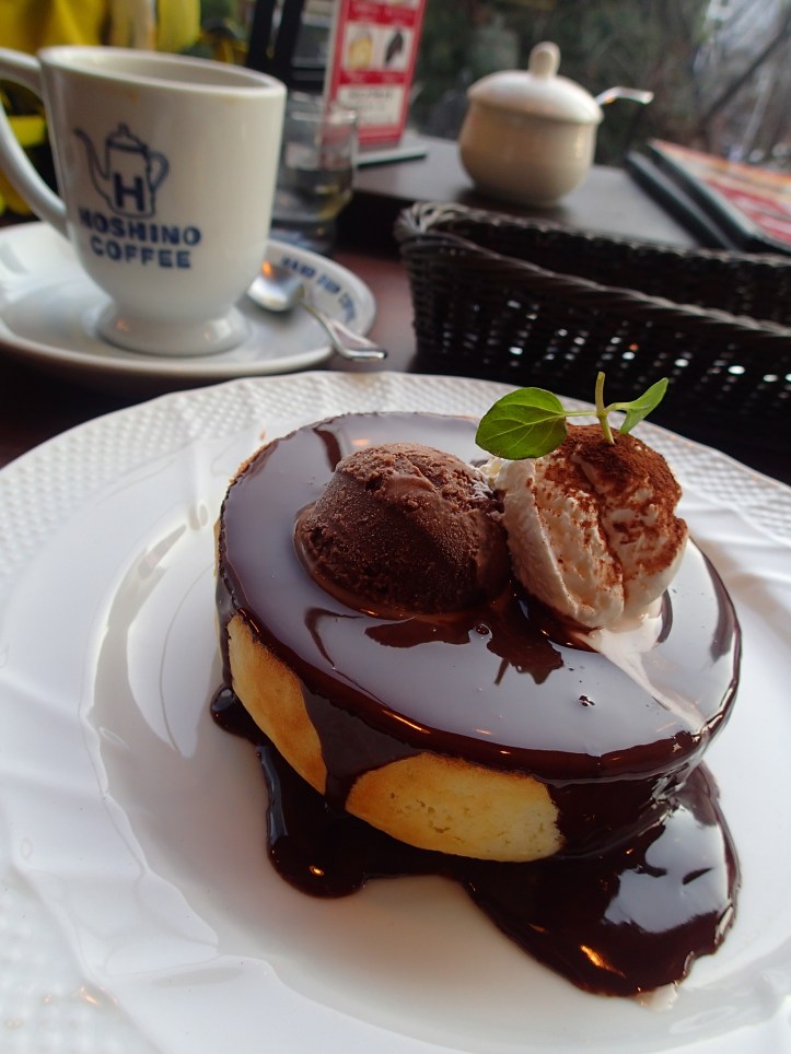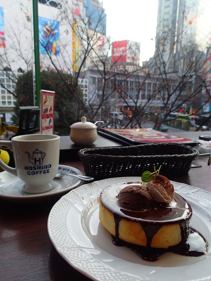 Hoshino Coffee is located in prime viewing of the Shibuya scramble crossing and we managed to snag a window seat. We ordered drip filter coffee and I ordered a souffle pancake with chocolate sauce.