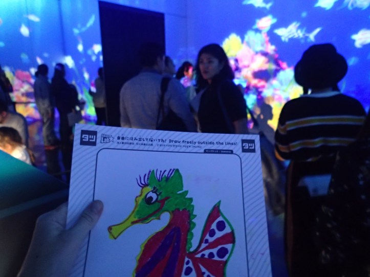 After devouring that bowl of ramen, it was on the Team Lab. I had a fun time there. Lots of cool interactive things and swirly lights and patterns. The best thing I thought, was being able to colour in a sea creature, have it scanned and then see it swimming on the wall with everyone else’s. Very clever.
