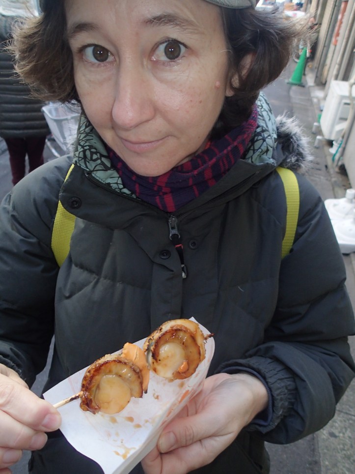 Steve was feeling a bit better today. Well, well enough to go out for a bit. We first wandered down to a nearby shopping arcade. Love these old shopping arcades in Japan. I would love to live near one. They sell fresh produce as well as anything else you might need. We couldn’t walk past these freshly grilled scallops.