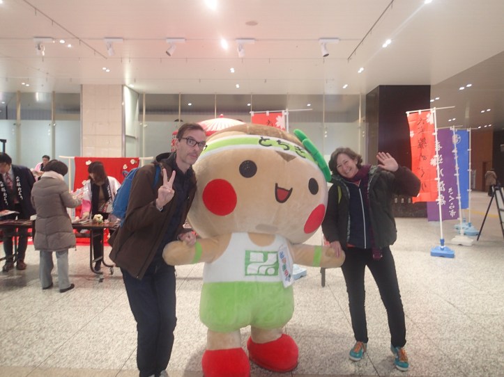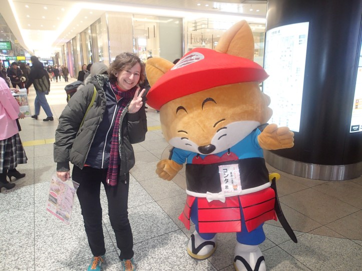 We were on our way when we realised we had caught the wrong train so we had to get off and change trains. Luckily for us, we got to meet some Prefecture mascots at the train station.
