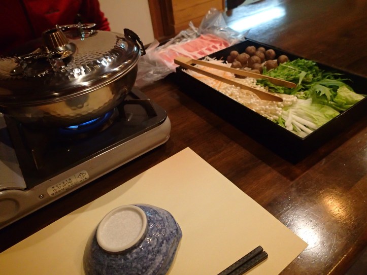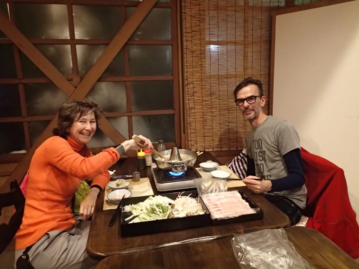 One of our favourite places in Nozawa (and one that we’ve been to on every trip) is a hot pot place. You have to pre book for dinner at least the night before. We always go in there in person and use our best Japanese to make a reservation. We booked the Pork Shabu Shabu this time. I can recommend the Wild boar hotpot also which we have had in the past. Very good indeed. So much food and very reasonably priced. And the owners are super cute and friendly – they were shocked that we had come all the way from our hotel to dine there (it’s only about a 10 minute walk!?!)