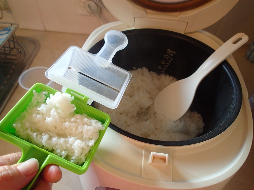 This is what happens….you cook some rice and then you fill half of the plastic contraption with rice.