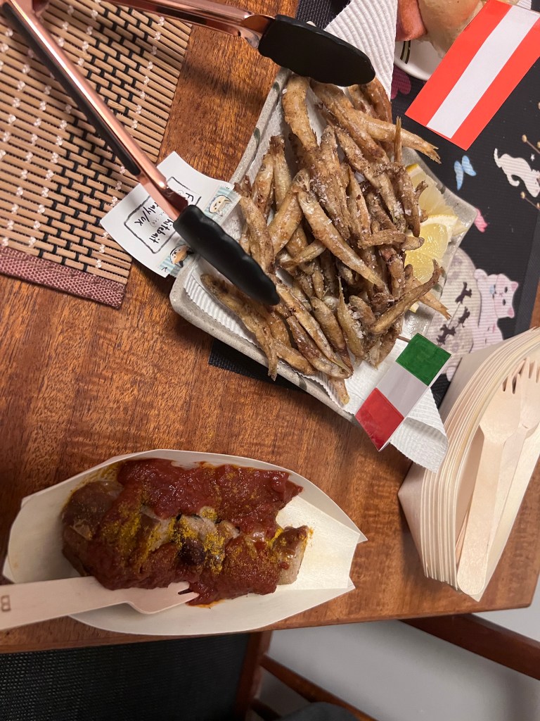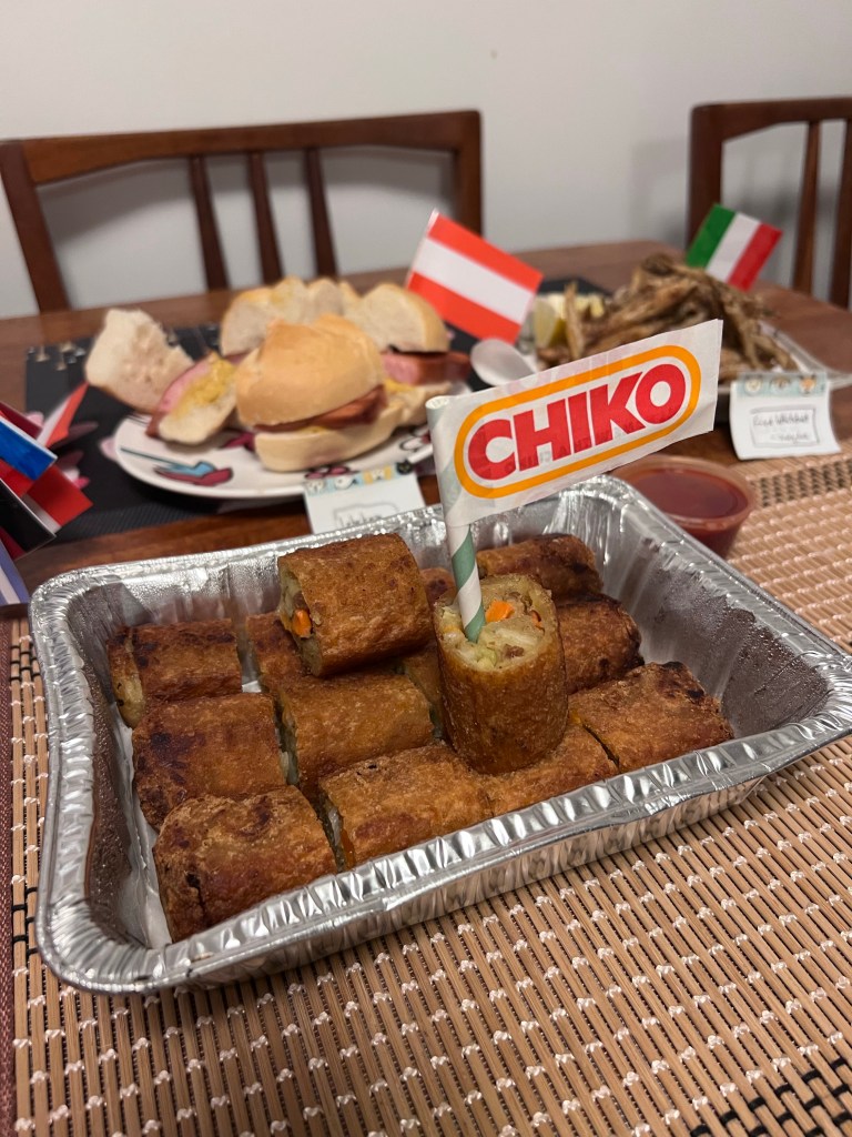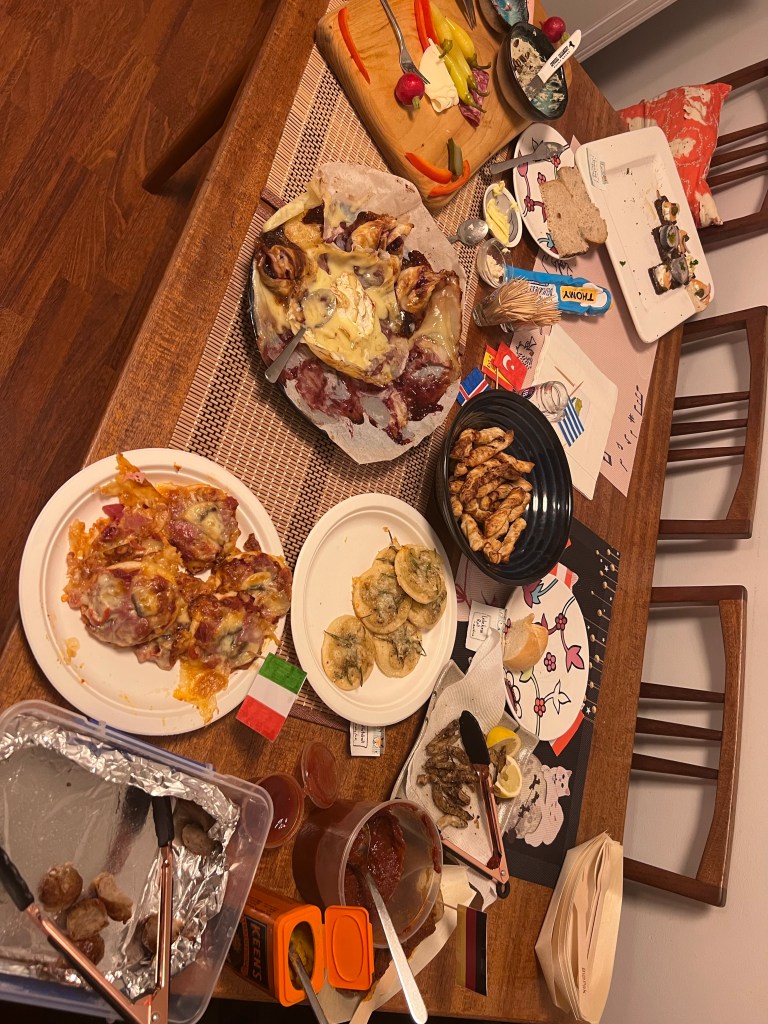 We had a few friends around and we all made/brought food. I say brought as our friend Adrian brought Chiko Rolls to represent Australia. Yes, Chiko Rolls, straight from the supermarket freezer to you. They proved popular. Though I must say not with me. I have never been a fan of mystery meat/vegetable products inside pastry (I also dislike pasties)