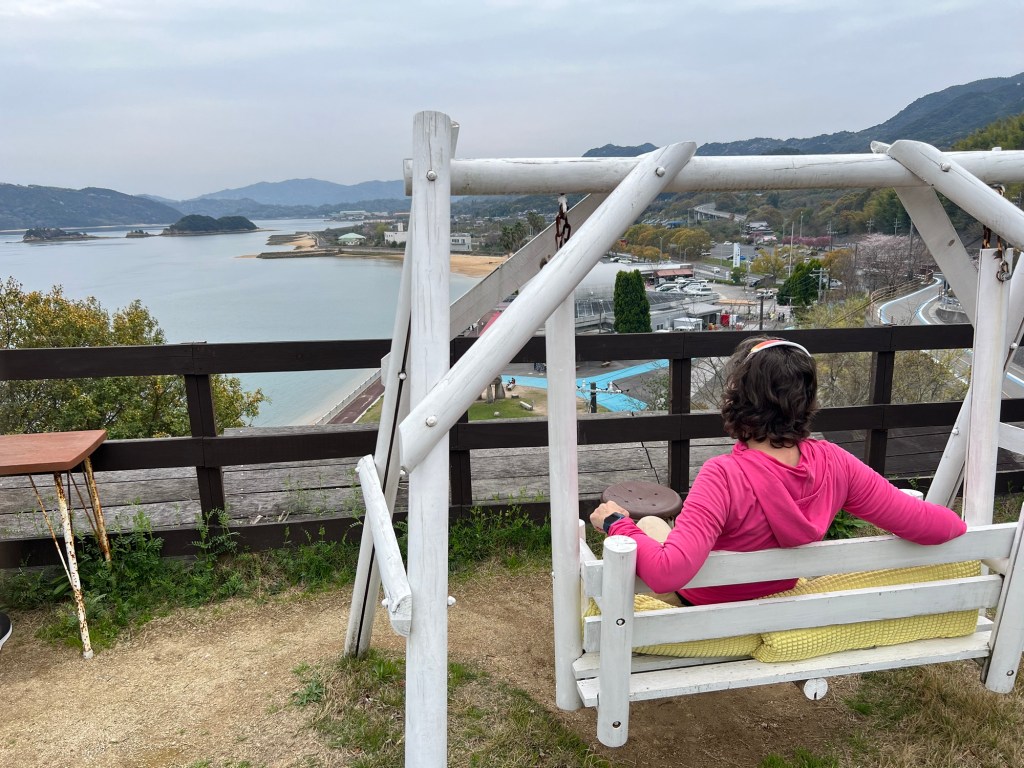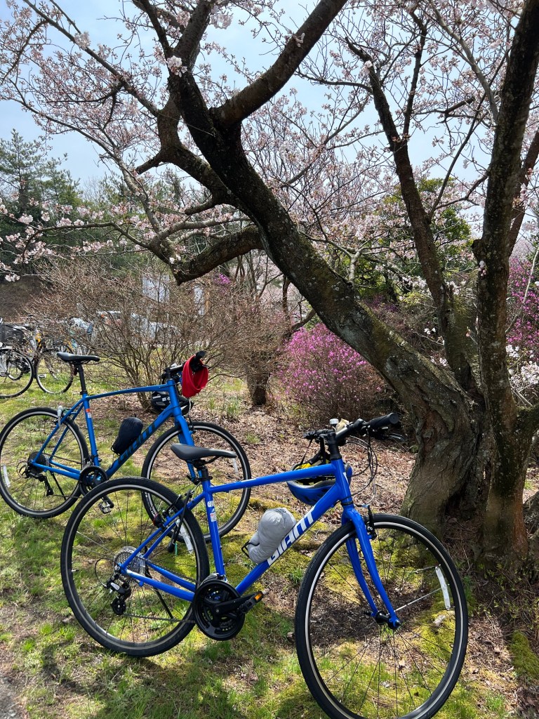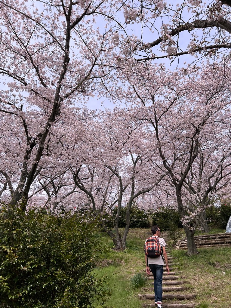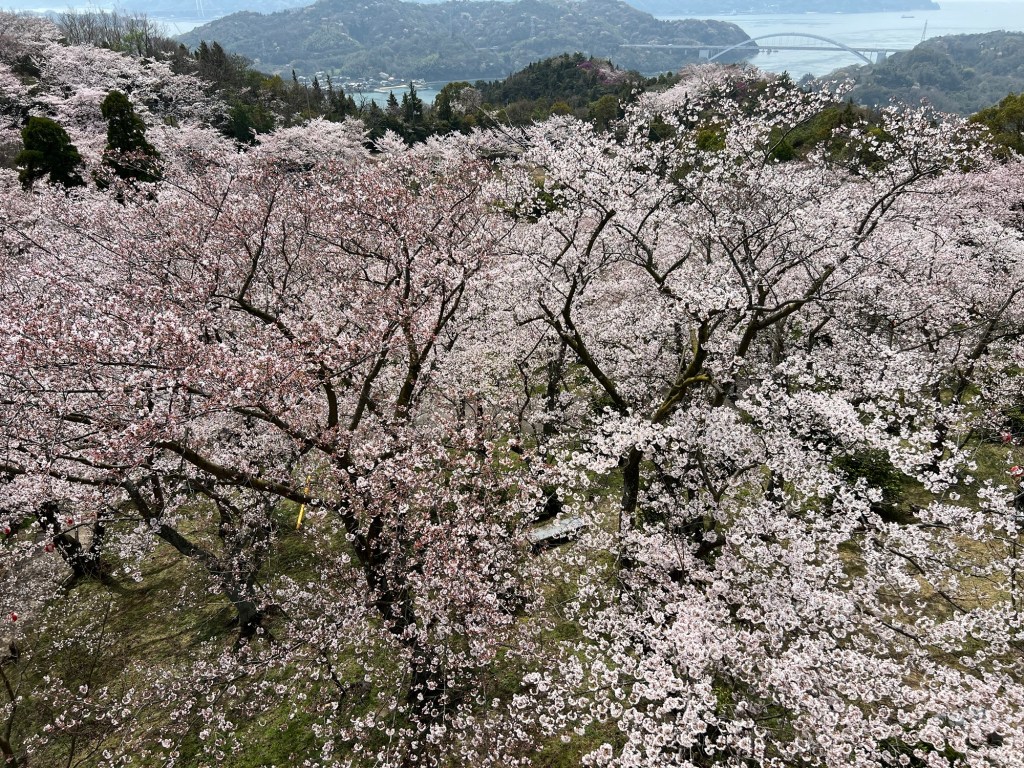Then it was on to the park – the name of which I can never remember no matter how many times I look at it – Hirakiyama Park. Ok, got it? No I’ve forgotten it already. I was recommended this park by a customer in a cafe in Matsuyama. All the maps say it’s a tough ride to get to the top. “meh! How hard can it be?” Well let me tell you…if you are planning on going…maybe get an e bike. I think I nearly died getting up there. I walked half the way pushing my bike and hoping to hell it would be worth it. Steve did better considering he’s still getting over the stupid cold he caught. But he does ride his bike to work every day and as I mentioned yesterday – Covid+cold + (I forgot to mention) hip bursitis = an unfit me. Yeh I know excuses, excuses. Anyway all that matters is we made it to the top, and maybe I did die getting there because let me tell you it was like a dream up there. Sakura in full bloom as far as the eye could see! So beautiful! So magical!