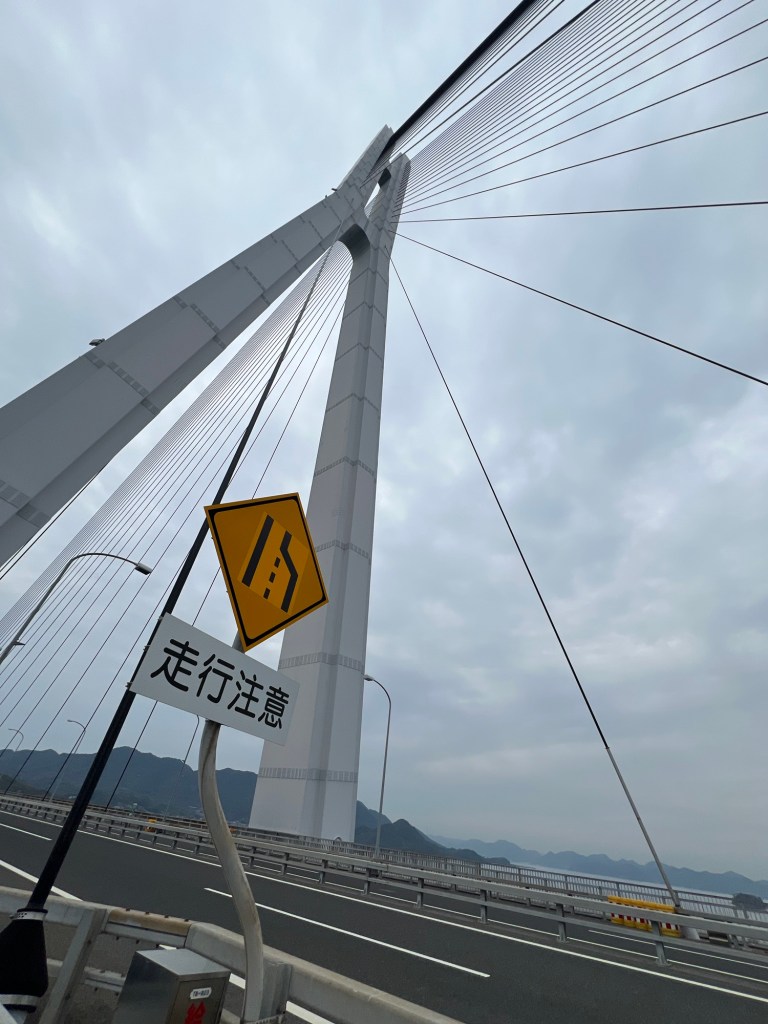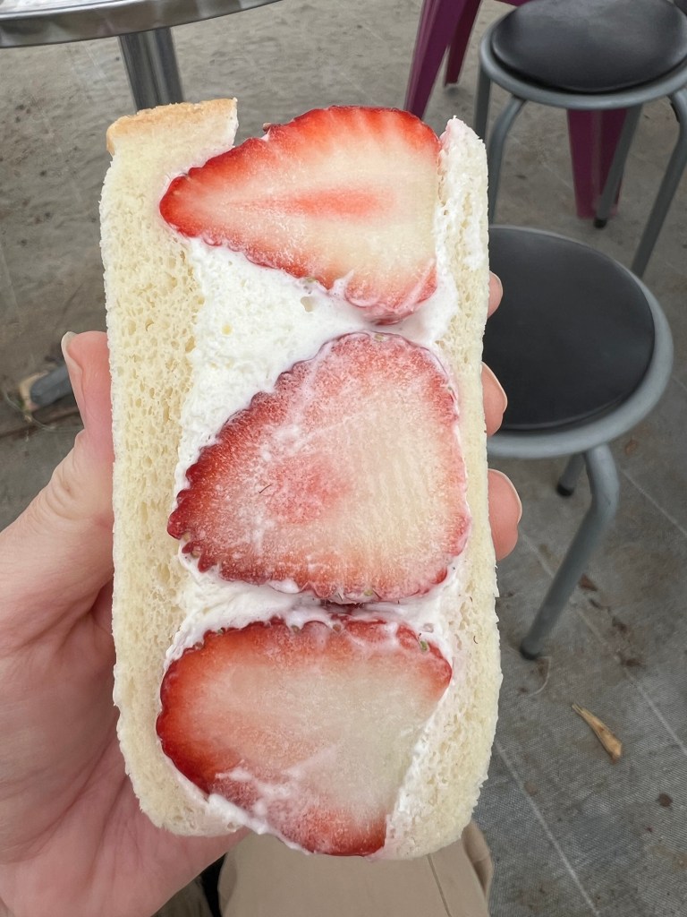 We had a plan to get to a coffee place that called Shimanami Coffee that I have been stalking on Instagram since 2020. We still had to get over another bridge to get there. On the way there we saw a strawberry farm – we stopped in for a look and saw they were selling strawberry sandos. Must have one of those. This was technically lunch.