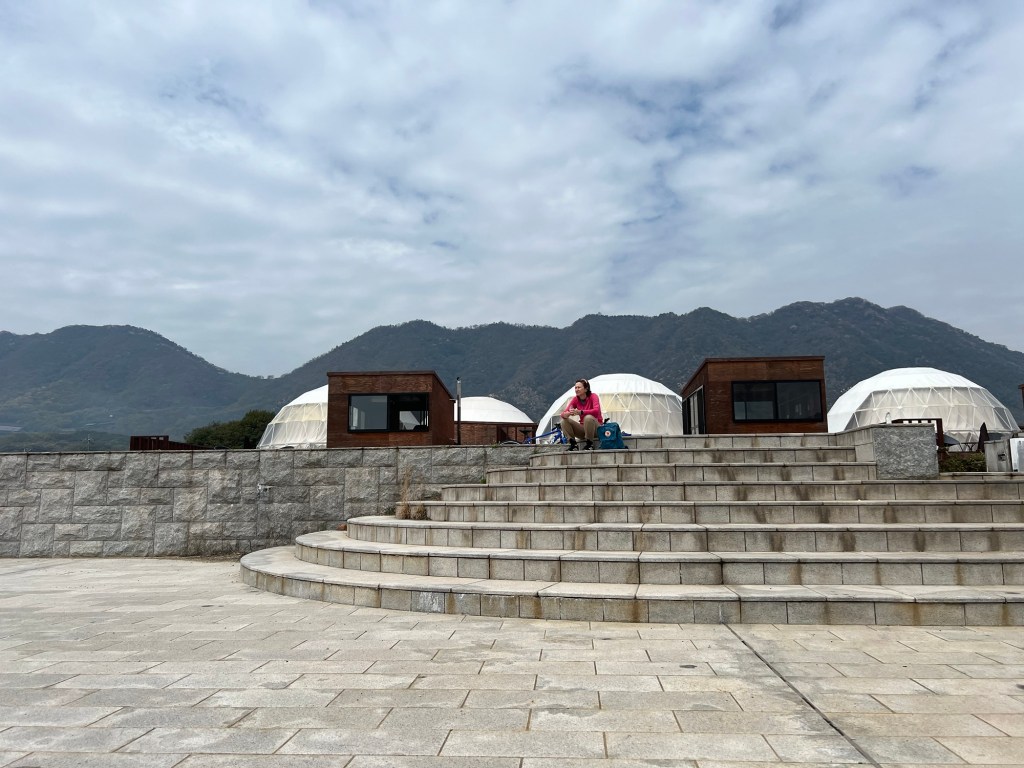 We stopped at some point near a campsite where you camp in Geodesic dome. Kind of cool. We had our Mikan juices. I don’t know why auto correct always capitalises Mikan but it does.See? It did it again.
