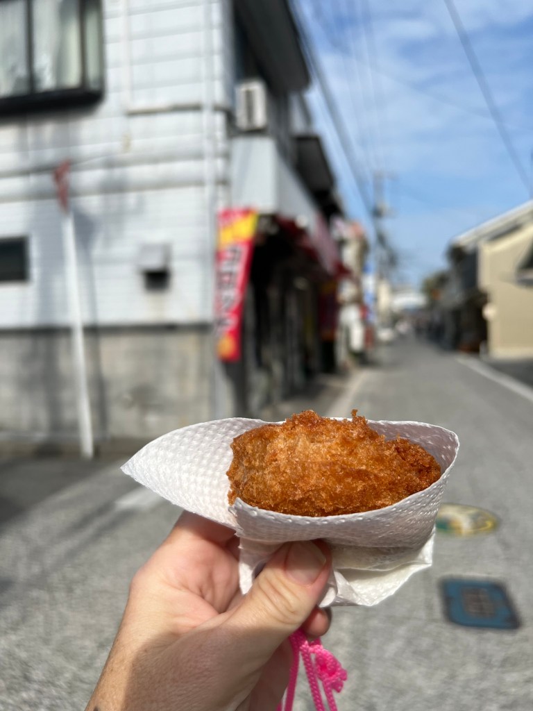 We dropped our bikes off at the ryokan and went to explore the shopping street – except because it was Sunday almost everything was closed. Except the lady who had been making croquettes since 9am this morning. I just had to buy one. It was so crispy and tasty!