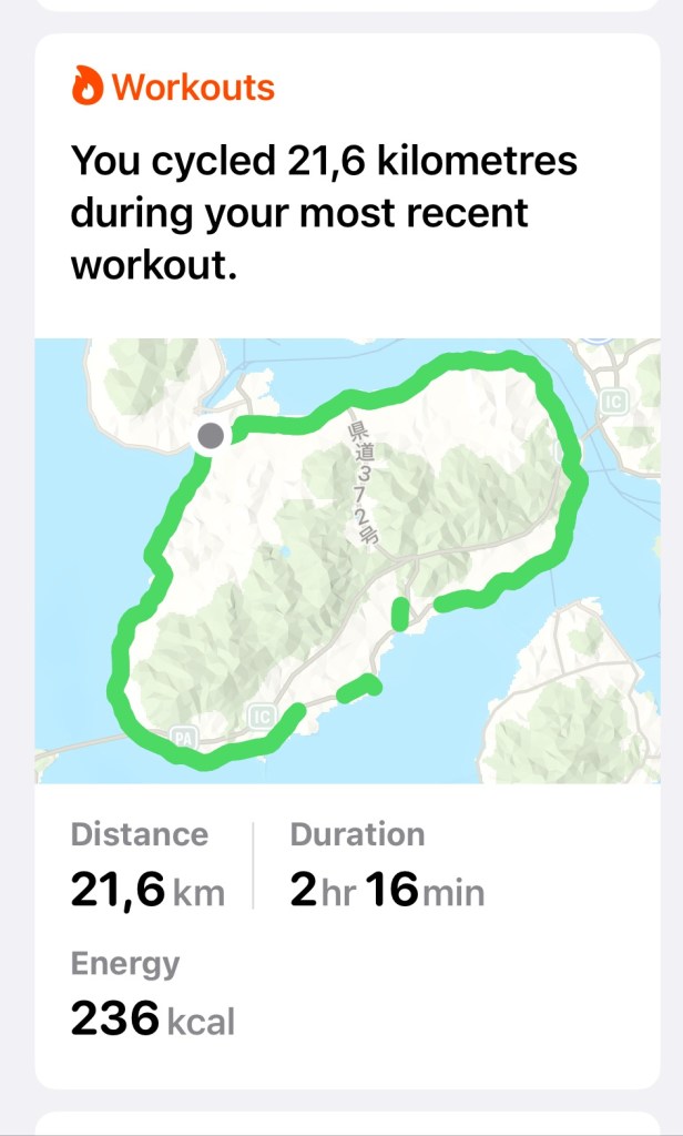 Our plan for the day, was to buy a bento for lunch from the pace around the corner that didn’t open until 10am and then ride slowly around the island. The map said it was a flat easy ride which is about all we were up to today.