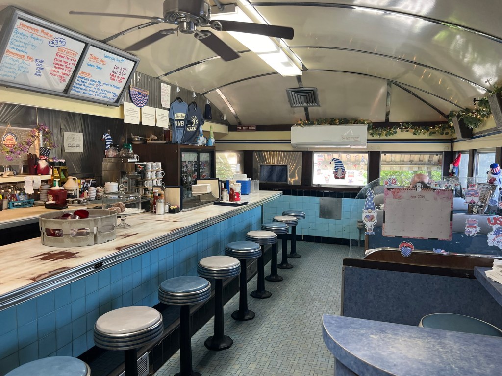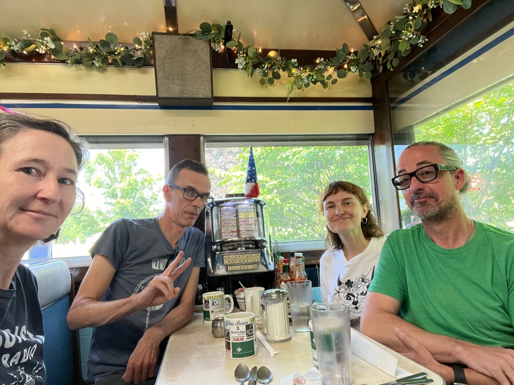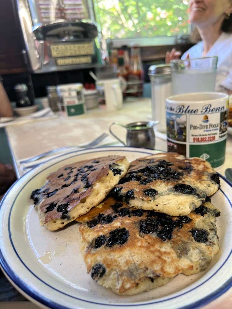 Then we headed off towards Brattleboro. It was a nice drive through lush green trees and swirly roads. When we got to Brattleboro though, it was a bit of a bust. We decided not to stay and instead headed over to Bennington, Vermont to meet up with Piper and Brett for lunch at the Blue Benn Diner. We visited here in 2019 and really enjoyed it, so a repeat visit was in order.